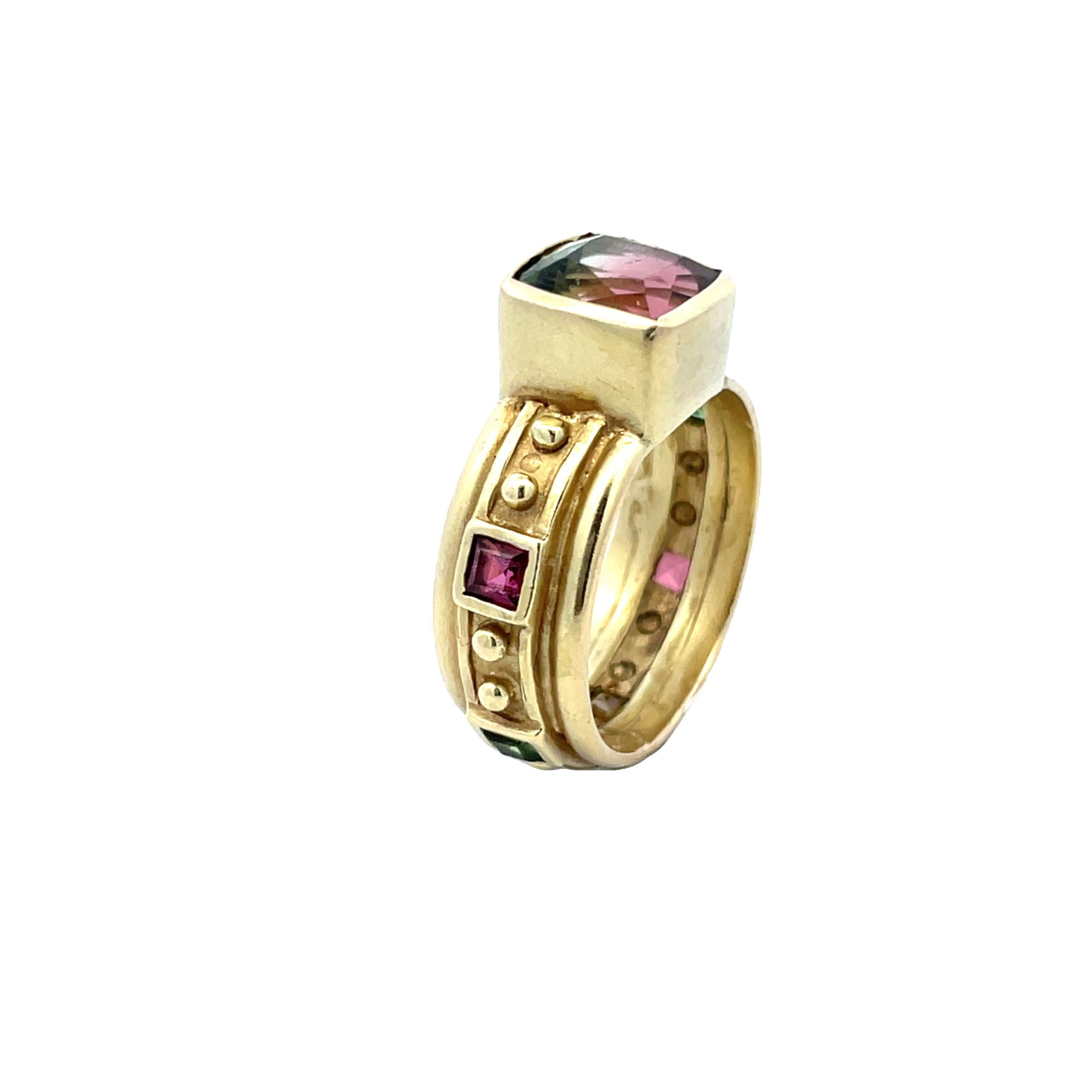 Rare bicolor cushion-cut tourmaline that shows strong red/green in incandescent light and color change peach/light green in daylight, shown on hand. The 14K gold ring, circa 1990’s, is set around the shank with square-cut tourmalines in a beaded finish. The ring measures 1″ x 3/8″ and is size 9.