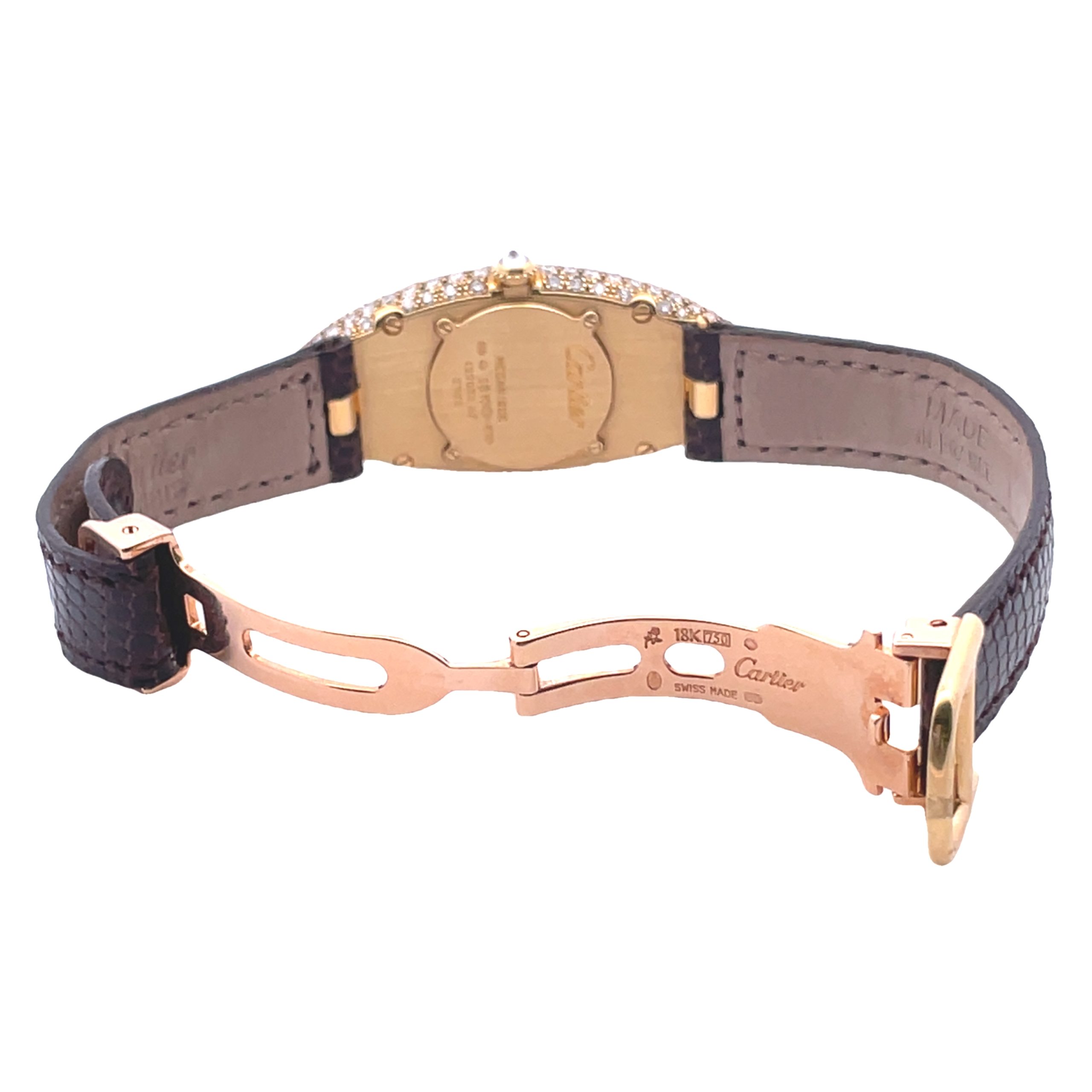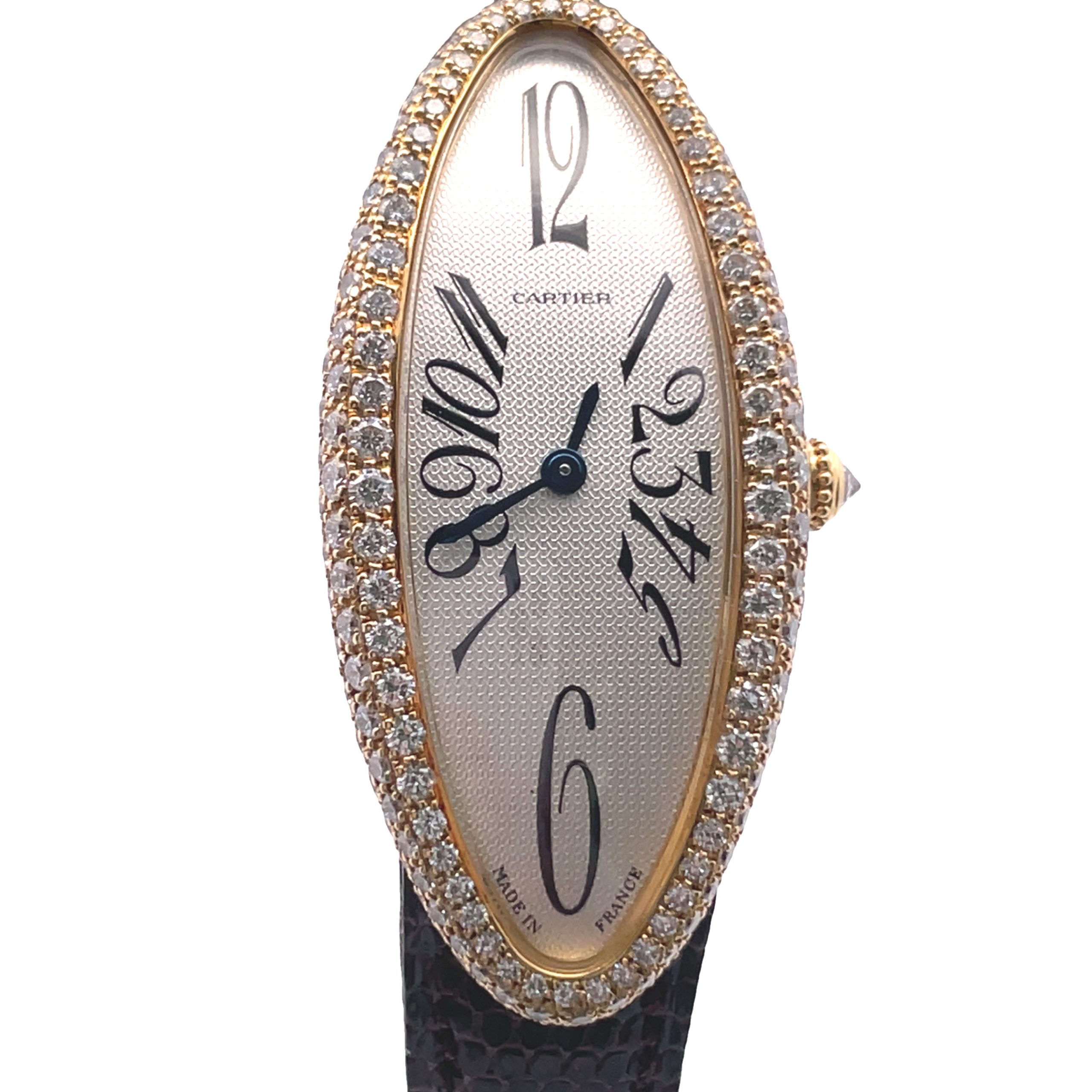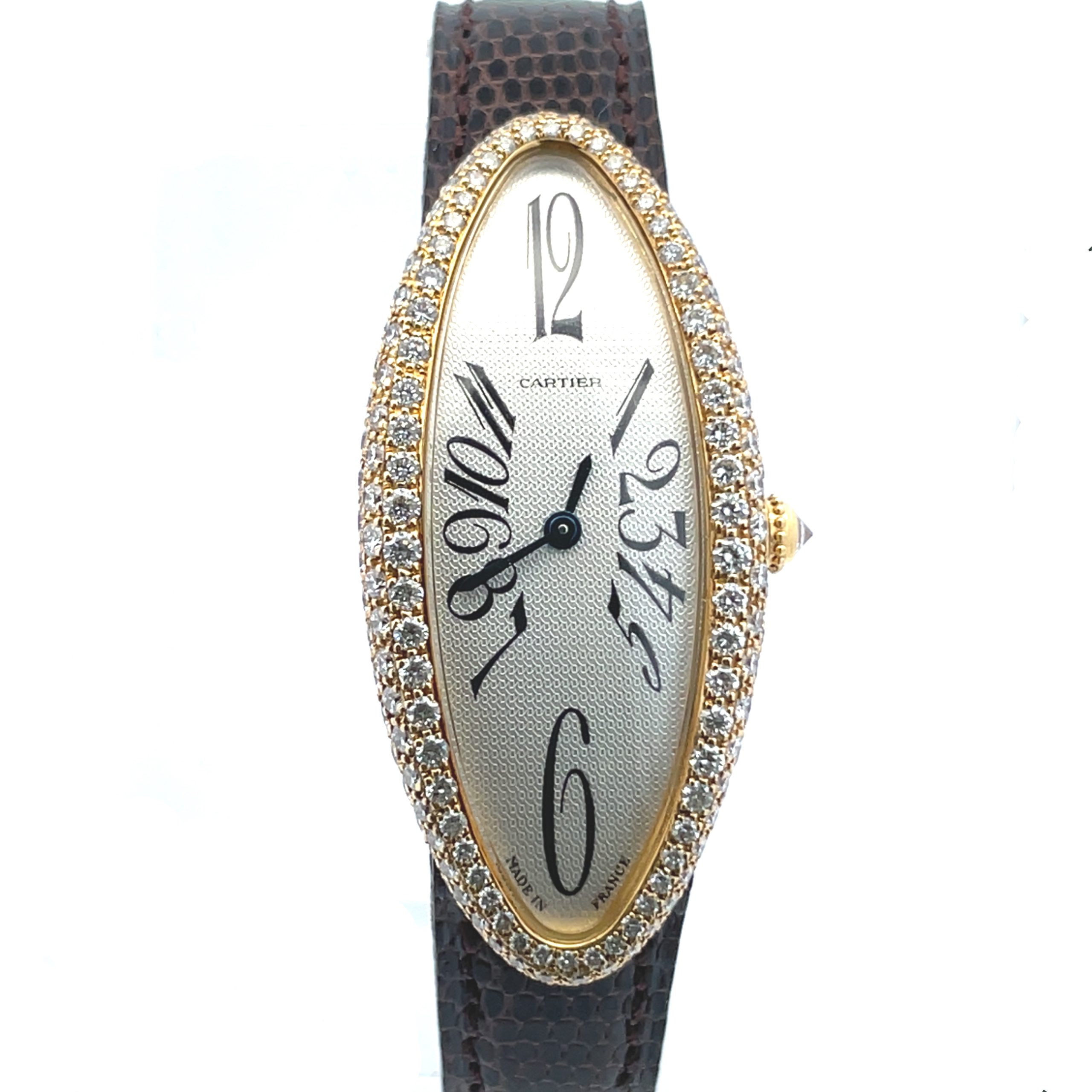 18K gold and diamond Cartier Baignoire Allongée, Ref. 2583, circa 1990’s, curved case with 3 rows factory-set diamonds, with strap and 18K rose gold Cartier deployant buckle. The 21mm x 47mm case with hidden lugs, made in France, features a silvered engine-turned patterned dial with painted black exploding Arabic numeral hours, blued steel épee hands and a diamond-set crown. The 6-1/2″ strap is adjustable, the movement is mechanical, warrantied by Aaron Faber for two years, accompanied by original paper and booklet.