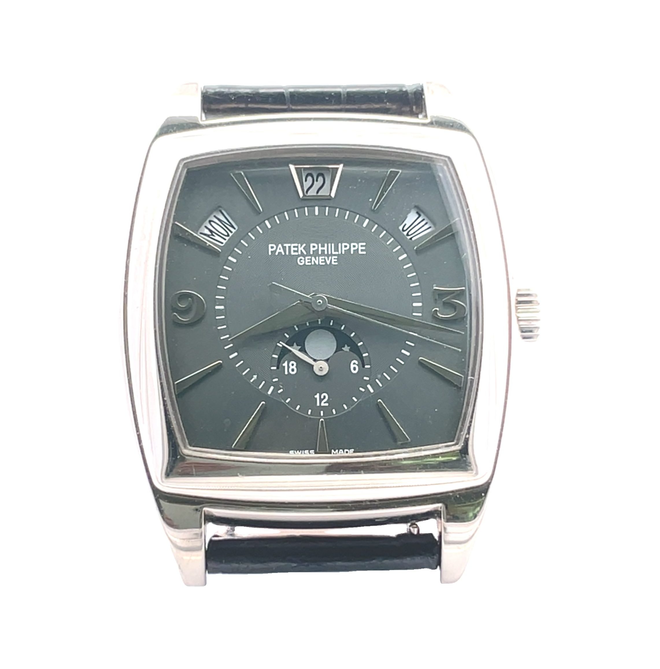 18K white gold Patek Philippe Ref. 5135G Gondolo Calendario automatic, circa 2006, is a rare oversize tonneau-shape moonphase calendar wristwatch. The 18K gold 38mm x 51mm case has a stepped bezel, curved lugs, correctors on the side of the case, transparent screwed-down case back, sapphire crystals. The anthracite dial has applied white gold Arabic numerals and dart indexes on a plain reserve, apertures for the days of the week at 10, the date at 12, the months at 2 and the moon phases and 24-hour display at 6, white gold dauphine hands. The 34 jewel automatic movement has a 21K rotor straight-line lever escapement, 21K gold rotor and is warrantied by Aaron Faber for 2 years.