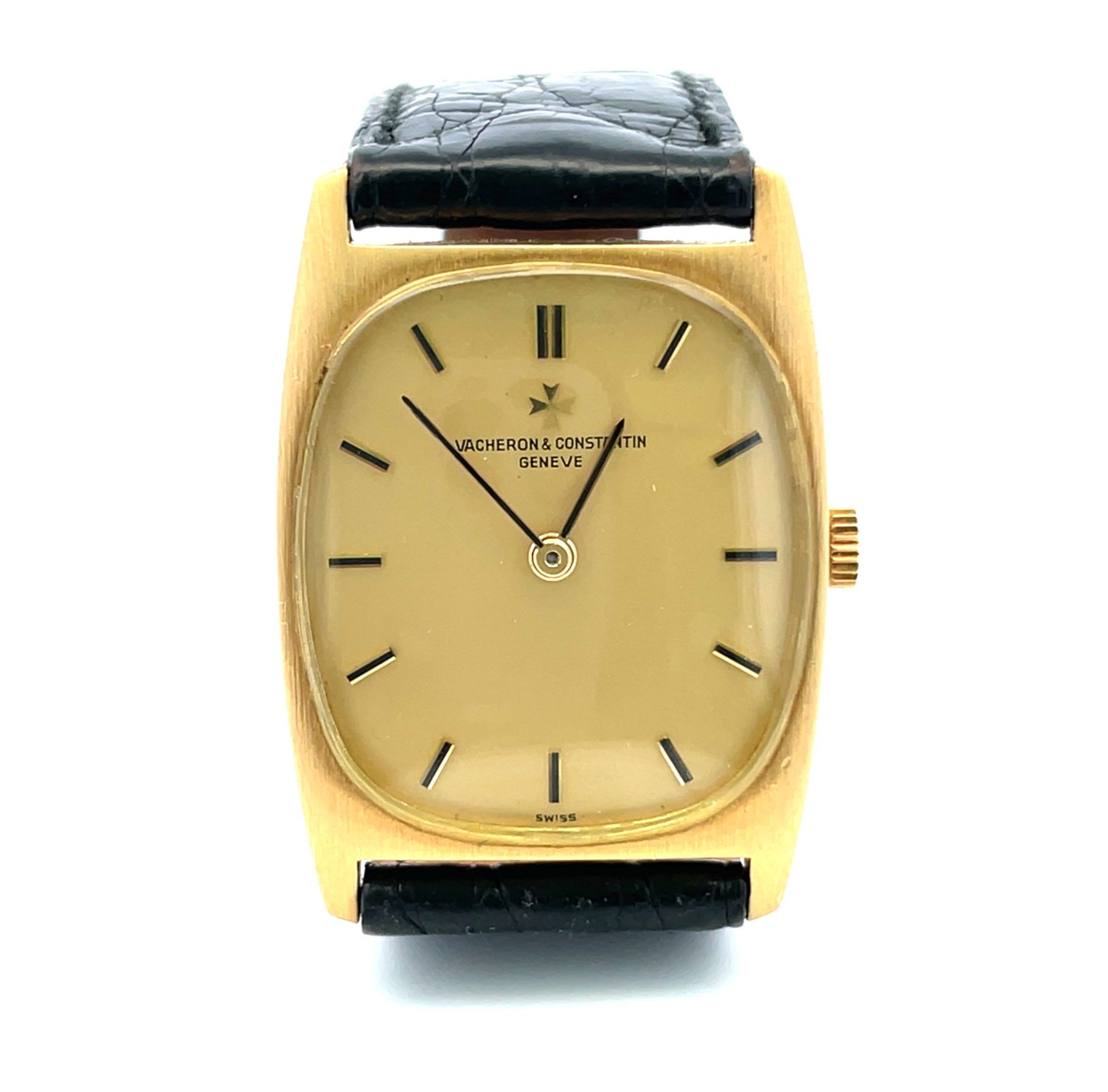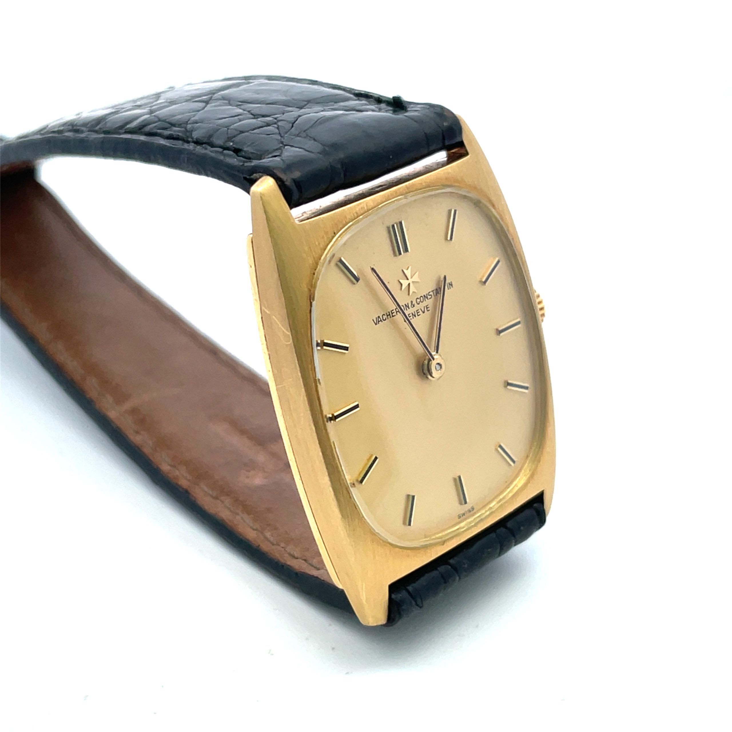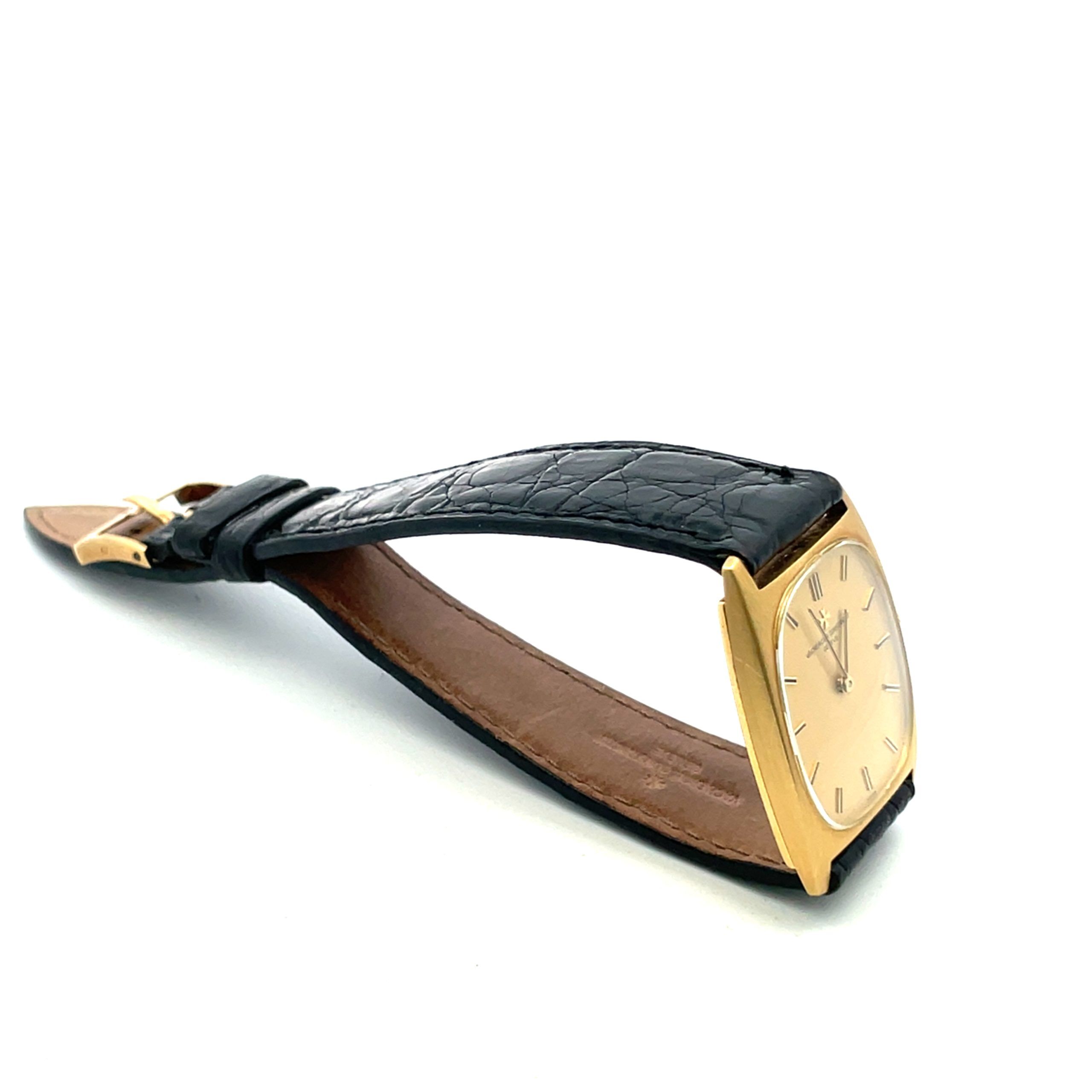 Vacheron & Constantin 18K yellow gold ultra-slim tonneau-shape men’s dress watch, circa 1970’s, ref. 7813, with original V&C buckle and crown; a fine, extra flat case, 25mmx35mm, with 17J mechanical manual wind movement, matte champagne dial with applied gold hour markers, in very good condition. Interesting detail: the case back has a double owl hallmark, indicating the watch was imported to France from Switzerland.