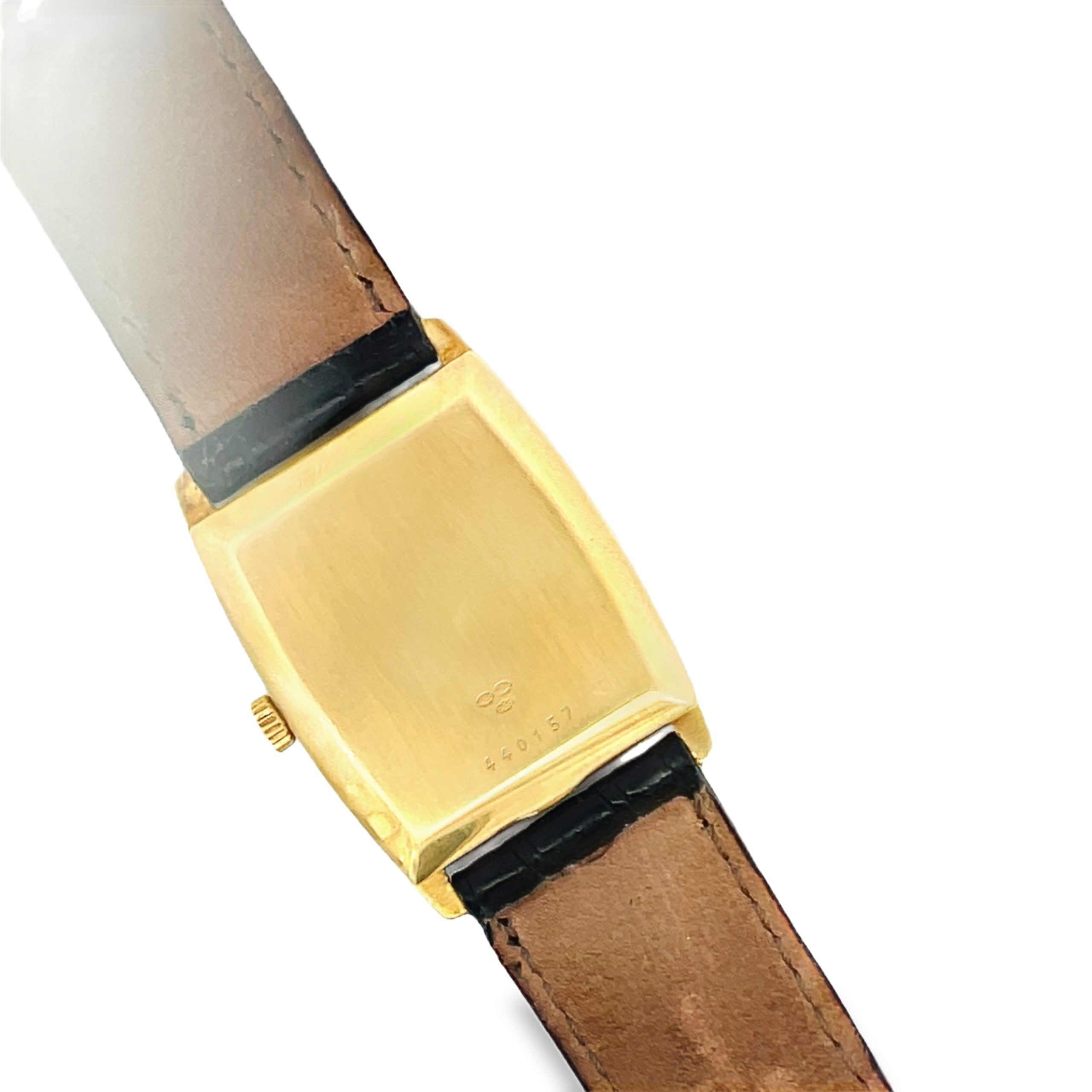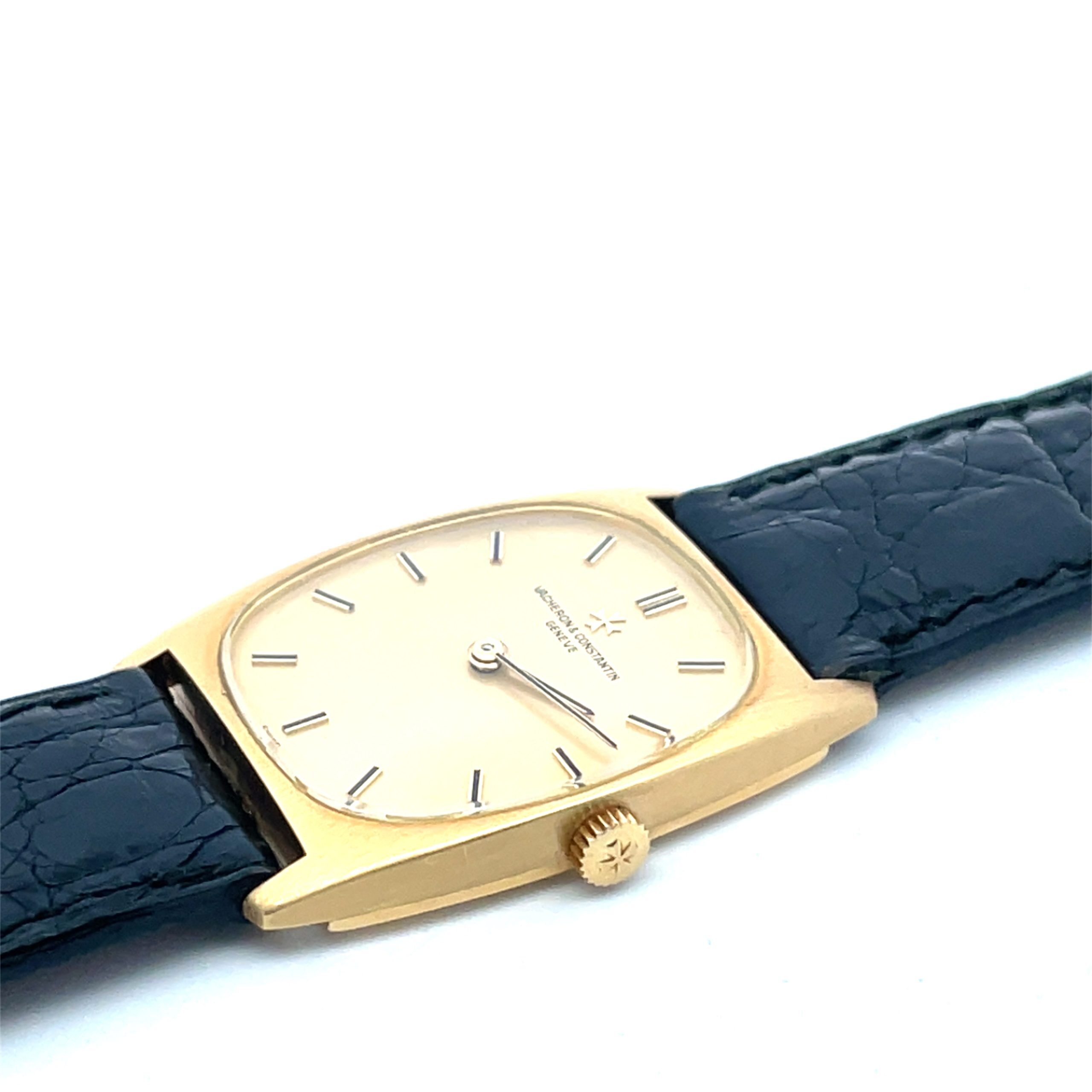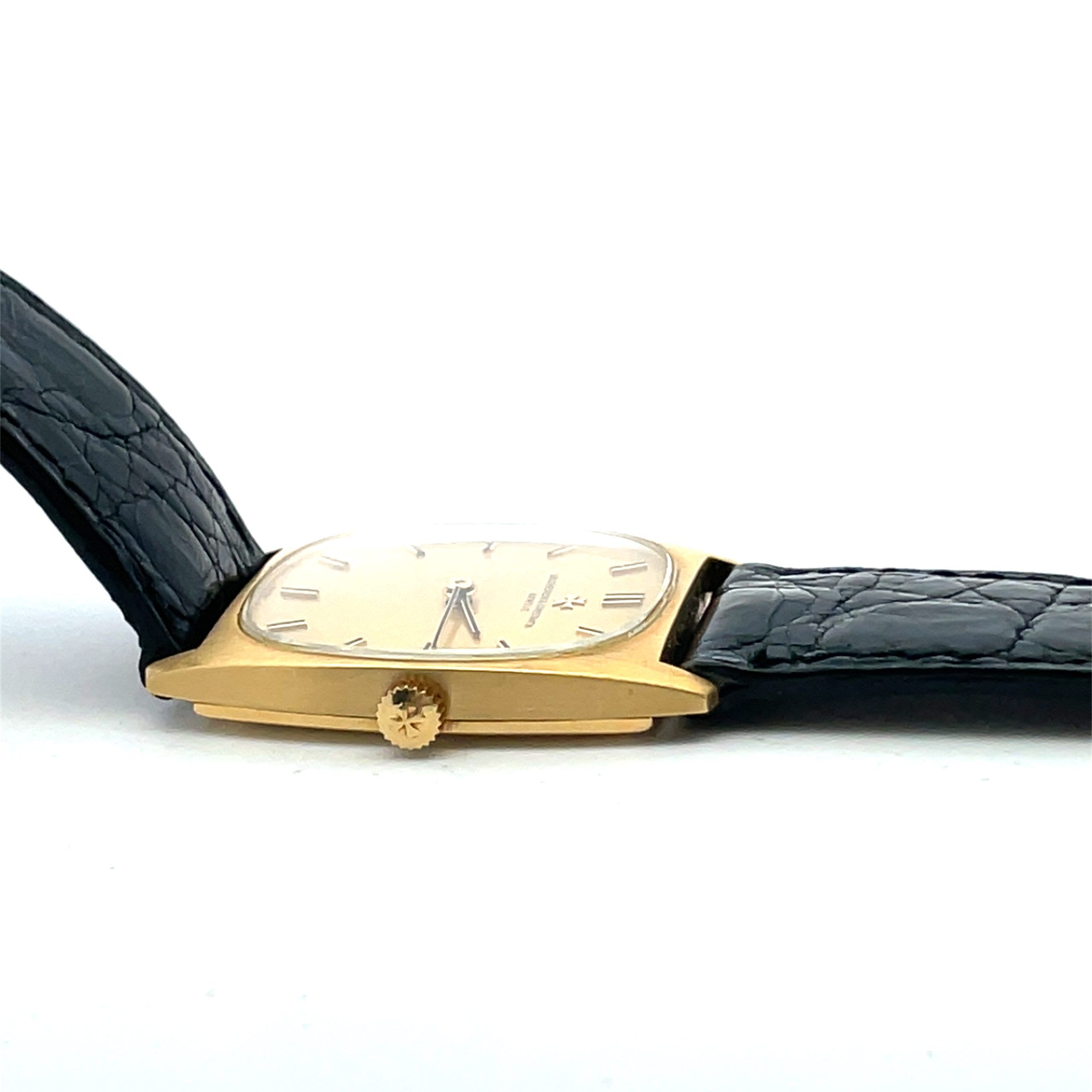 Vacheron & Constantin 18K yellow gold ultra-slim tonneau-shape men’s dress watch, circa 1970’s, ref. 7813, with original V&C buckle and crown; a fine, extra flat case, 25mmx35mm, with 17J mechanical manual wind movement, matte champagne dial with applied gold hour markers, in very good condition. Interesting detail: the case back has a double owl hallmark, indicating the watch was imported to France from Switzerland.