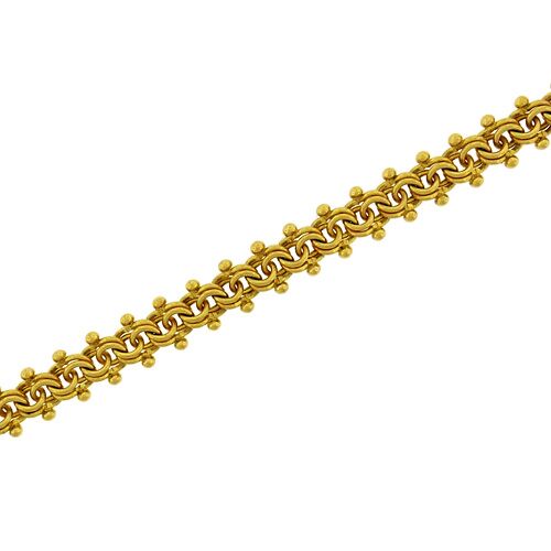 Lucie Heskett-Brem is the Goldweaver: she begins with a pure 24K gold ingot, alloys it slightly to 20K gold, then draws out the wires with which she will make each loop of this flexible double links heavy bracelet, in her studio by hand. Her work is truly luxurious, yet simple. 7-1/2″ long, 1/2″ wide.
