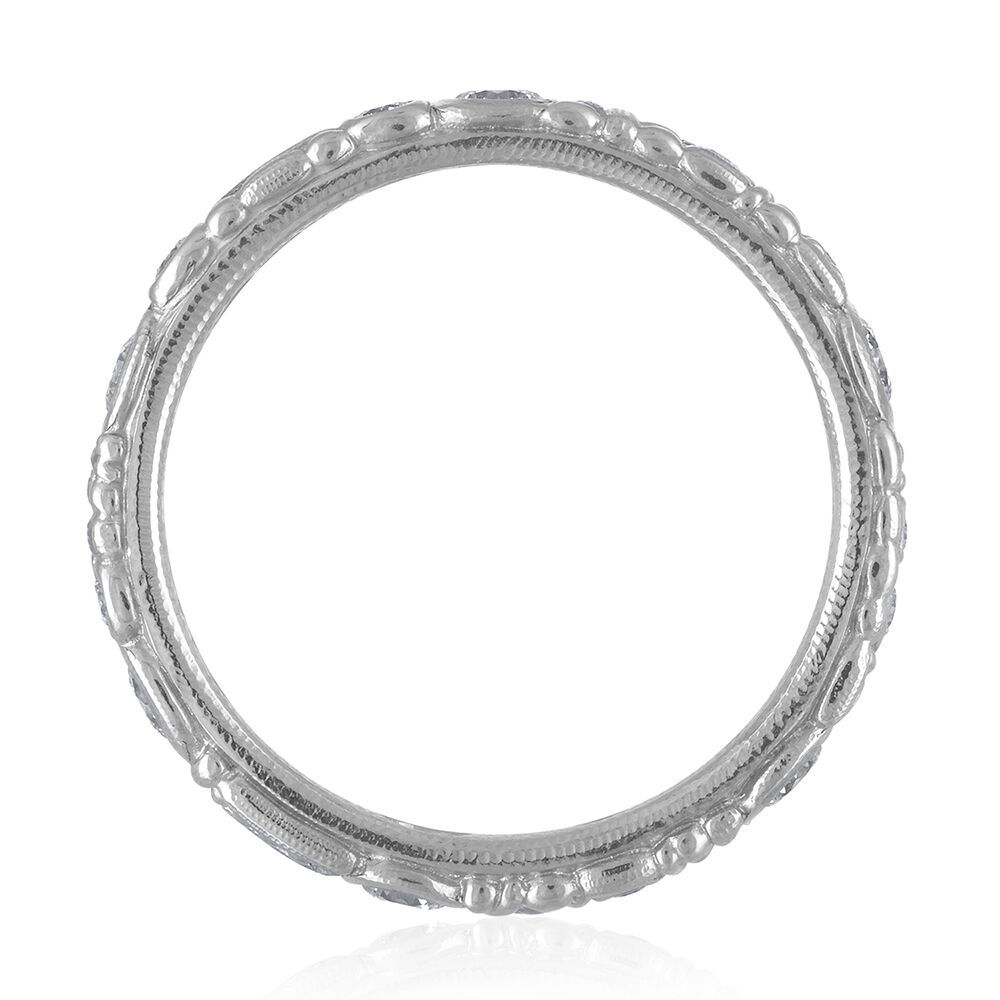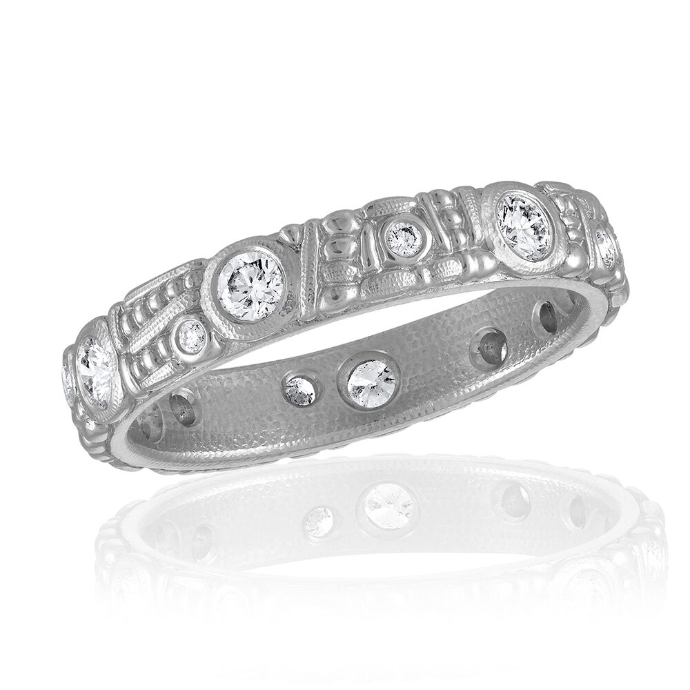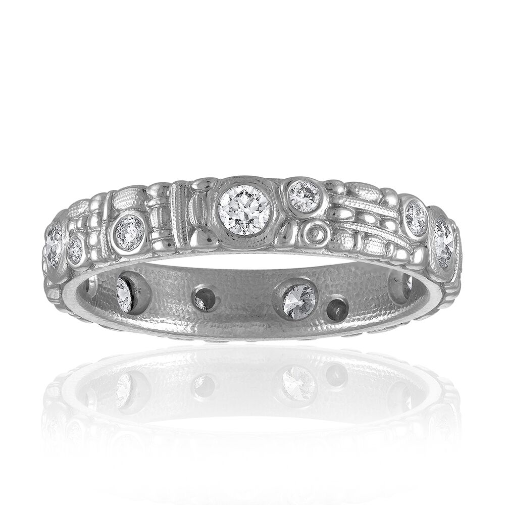 Alex Sepkus’ carved and bead narrow platinum and diamond band is 3.5mm, set with 0.42 cts diamonds.