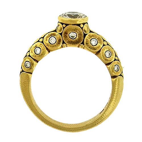 Alex Sepkus’ confection of an engagement ring, sets 0.21 carats diamonds in the 18K yellow gold mounting along the sides, accenting the detail of design and craftsmanship that has made Sepkus’ jewelry so sought after. The bezel-set mounting is design for a half-carat diamond or 5.5mm colored gemstone.