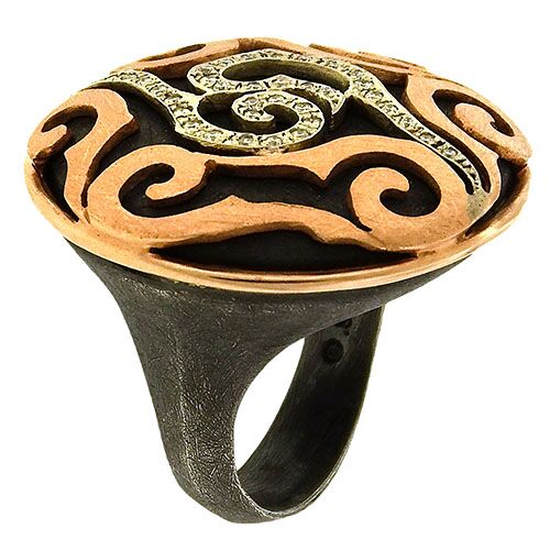Alishan’s bold interpretation of traditional forms makes his jewelry designs classic yet contemporary, as with this contrasted scroll cocktail ring. 18K rose gold is silhouetted over oxidized sterling, set with 01.7 cts diamonds in a graceful scroll design. The ring measures 1-1/8″ in diameter