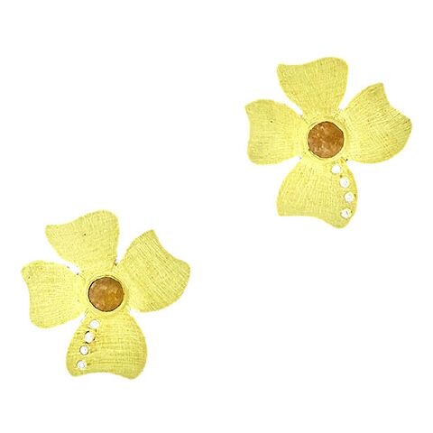 Alishan’s rose-cut natural diamond earrings set honey-colored diamonds, 1.00 cts tw, at the center of the graphic four-petal earring, with a small splash of colorless diamond melée, 0.04 cts. The earrings measure 3/4″ diameter.