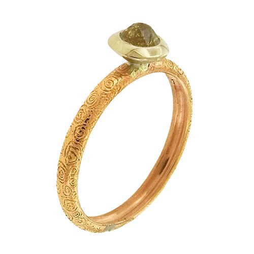 Alishan’s natural diamond stacking rings are great to wear stacked or solo, this one particularly so, 18K rose gold with engraved finish, set with a 0.42 ct natural diamond in 18K white gold bezel. The ring is 3/16″ in diameter.