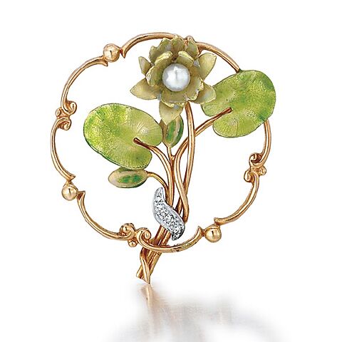 A rare American Art Nouveau enamel waterlily pin, ca. 1920’s, in 14K gold and green enamel, with pearl and diamonds, with hallmark of Krementz Jewelers, Newark. 1-1/2″ diam.