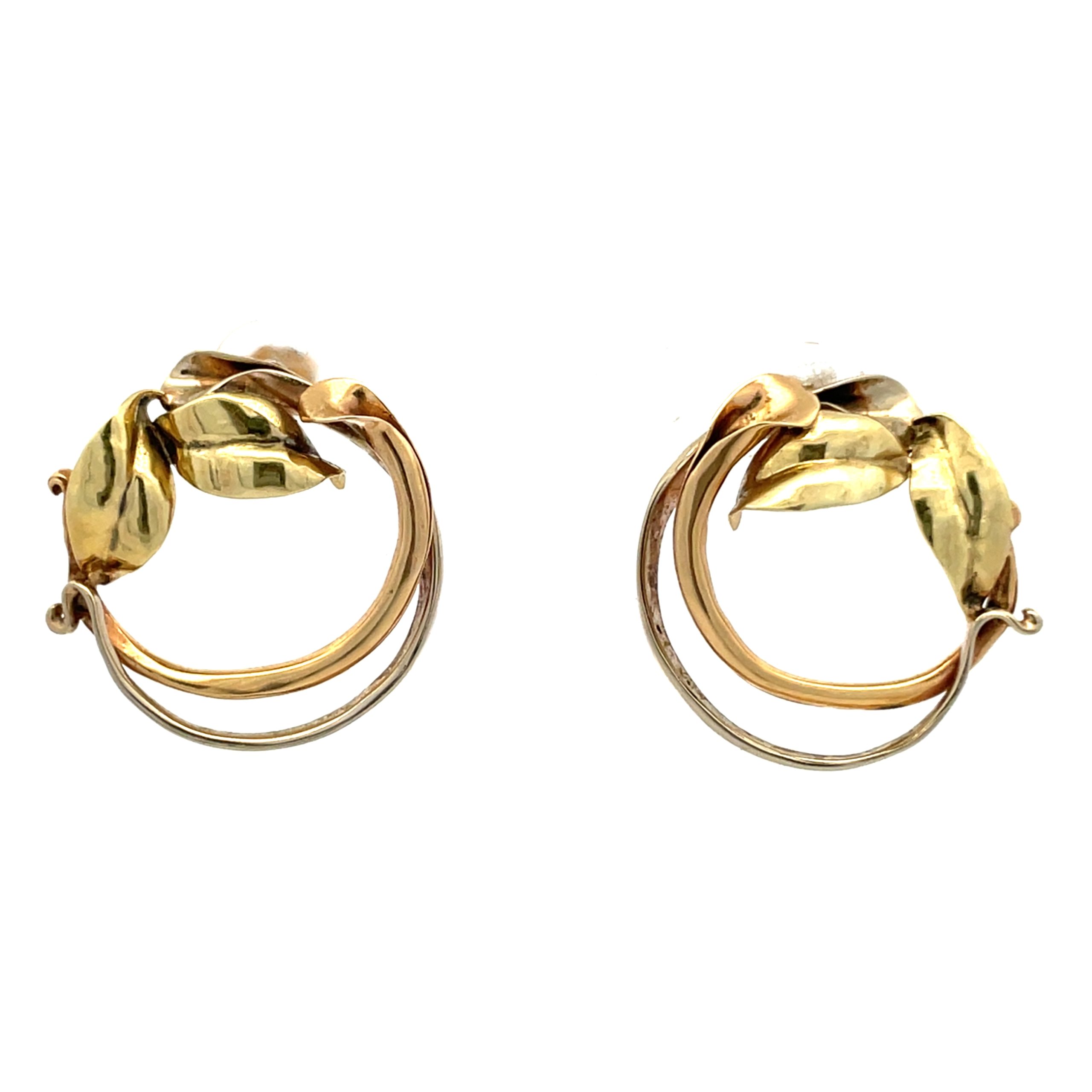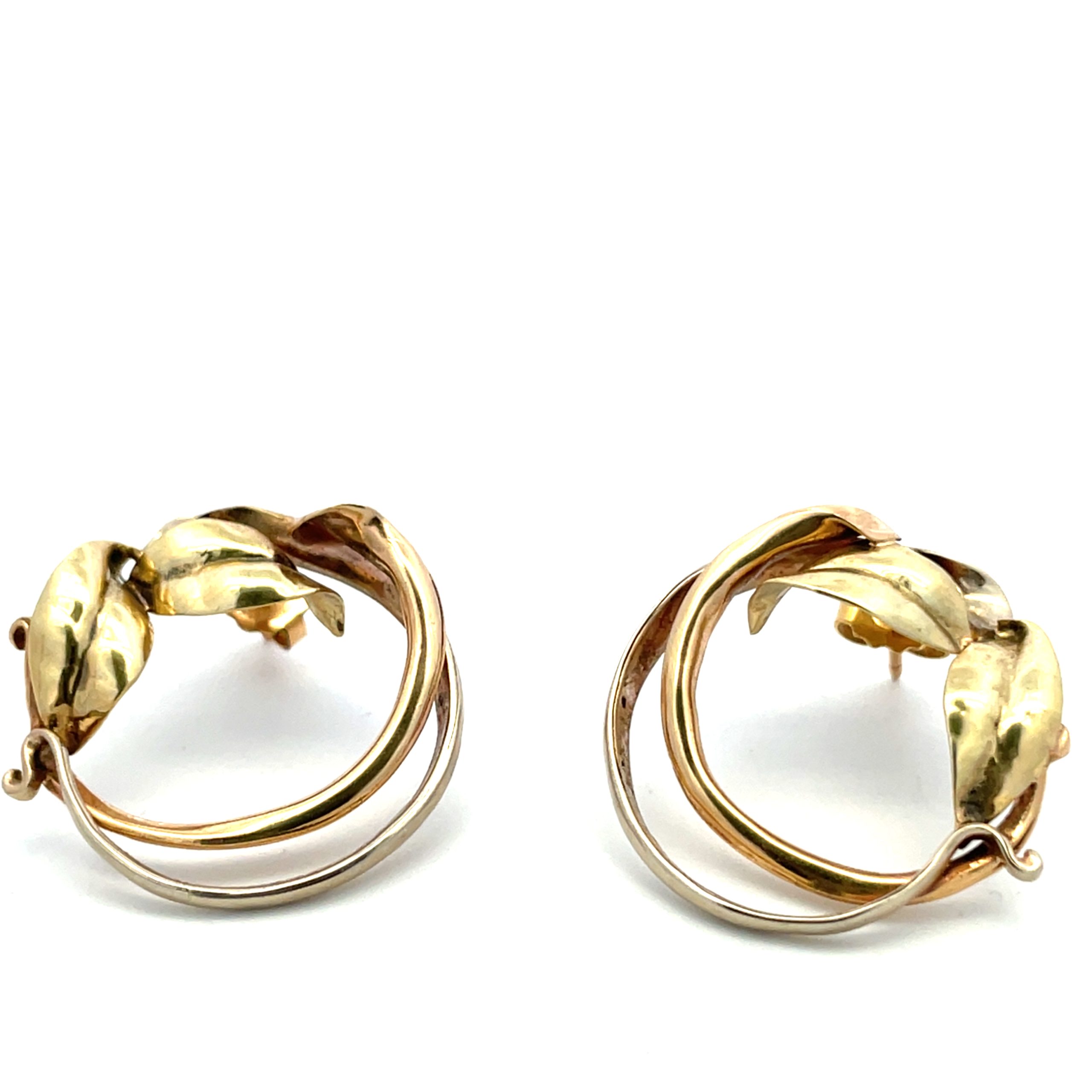 Goldsmith Angela Conty’s 14K yellow, white and rose gold vine leaf earrings, circa 1990, measure 1″ in diameter, signed by the artist.