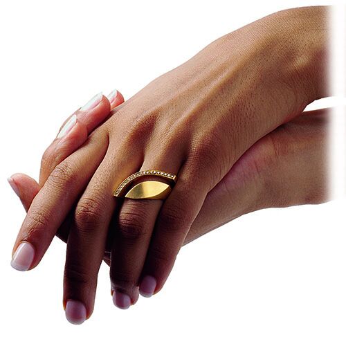 Angela Hubel’s ‘Diamond Eye’ sculptural ring curves along the finger when worn, the two elements — diamond pavé crescent, 0.27 cts, and 18K navette shape eye — float next to each other separated by a curve of negative space and the hand. Hubel designs rings so meticulously that this one is made for the left hand — and can be ordered for the right hand — or worn on the middle finger on either hand. 1-1/4″ x 5/8″.