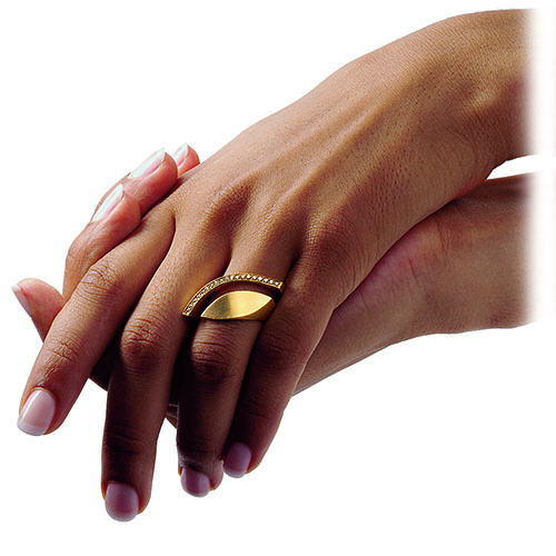 Angela Hubel’s ‘Diamond Eye’ sculptural ring curves along the finger when worn, the two elements — diamond pavĂ© crescent, 0.27 cts, and 18K navette shape eye — float next to each other separated by a curve of negative space and the hand. Hubel designs rings so meticulously that this one is made for the left hand — and can be ordered for the right hand — or worn on the middle finger on either hand. 1-1/4″ x 5/8″.