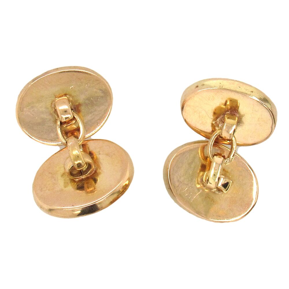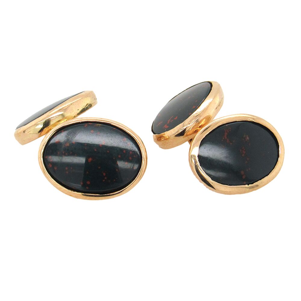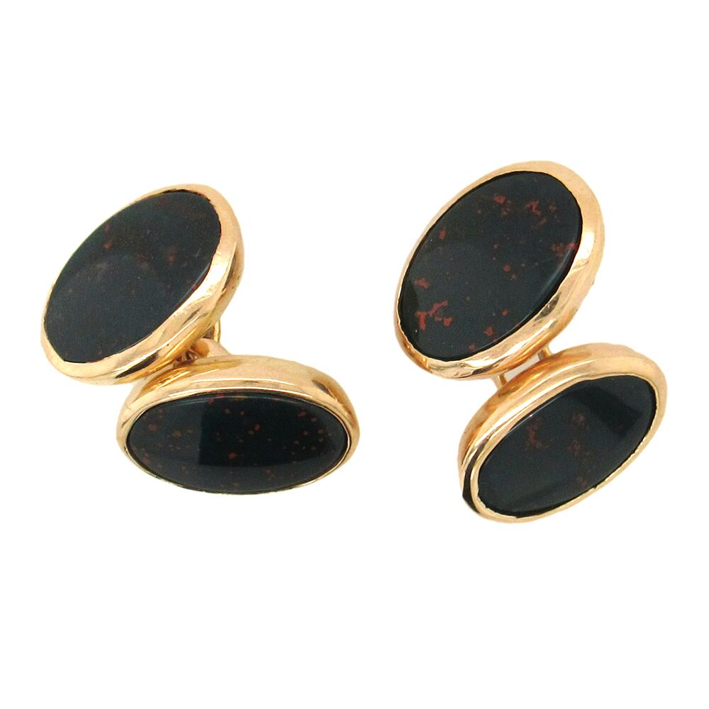 Oval antique bloodstone cufflinks set in 18K gold measure 3/8″ x 5/8″.