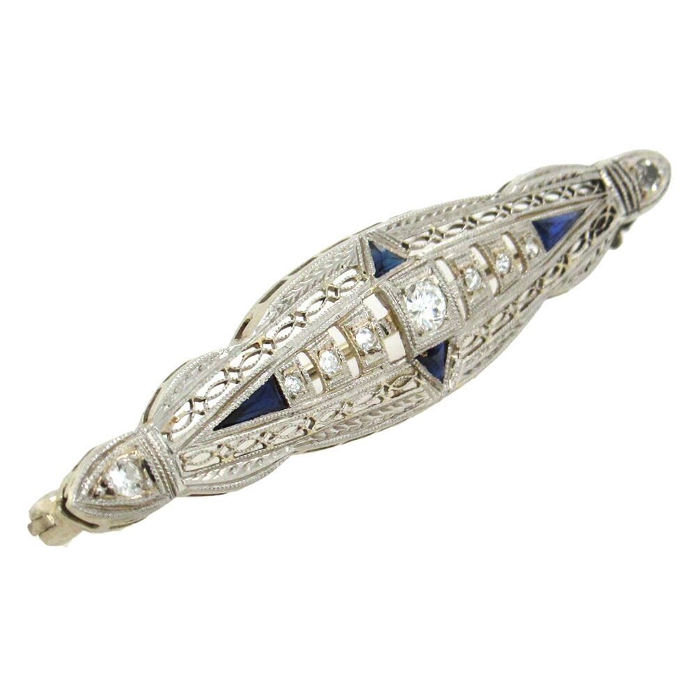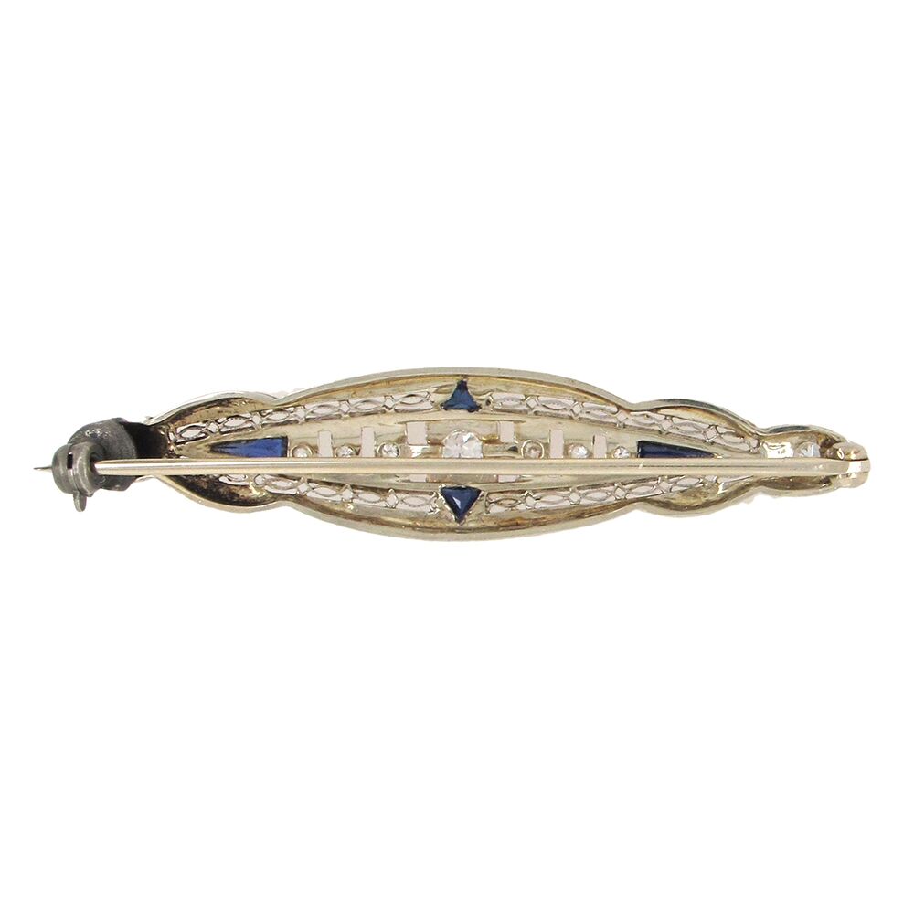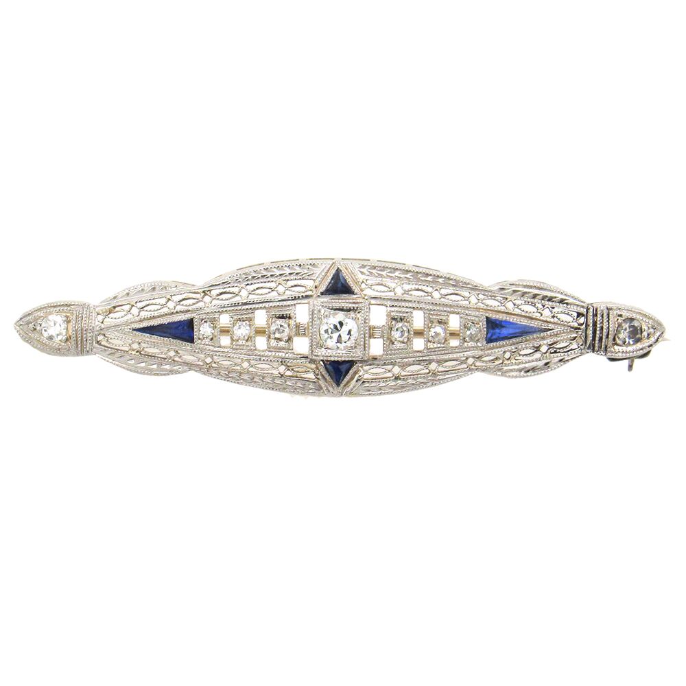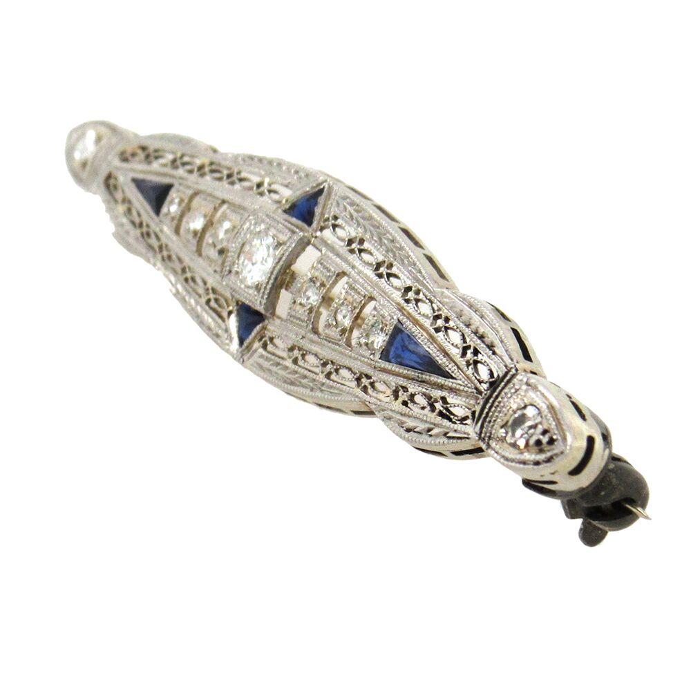 Antique white gold filigree marquis bar pin set with full-cut and single-cut very lively diamonds and accented with triangular synthetic sapphires. The brooch measures 2-1/8″ x 3/8″.