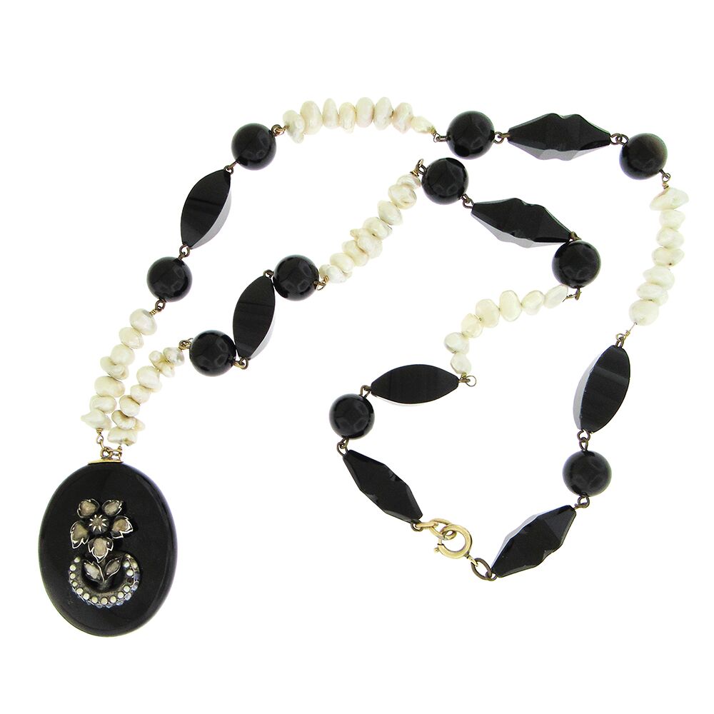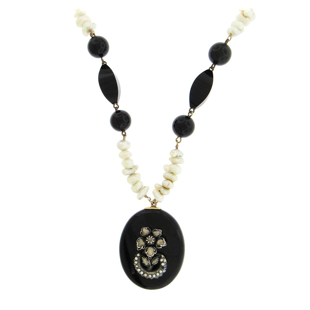 Antique Georgian oval onyx, seed pearl and rose cut diamond pendant, the diamonds set in silver with 1-1/2″ x 1-3/4″ x 3/4″, on a later freshwater pearl and onyx necklace, 25″ long. .