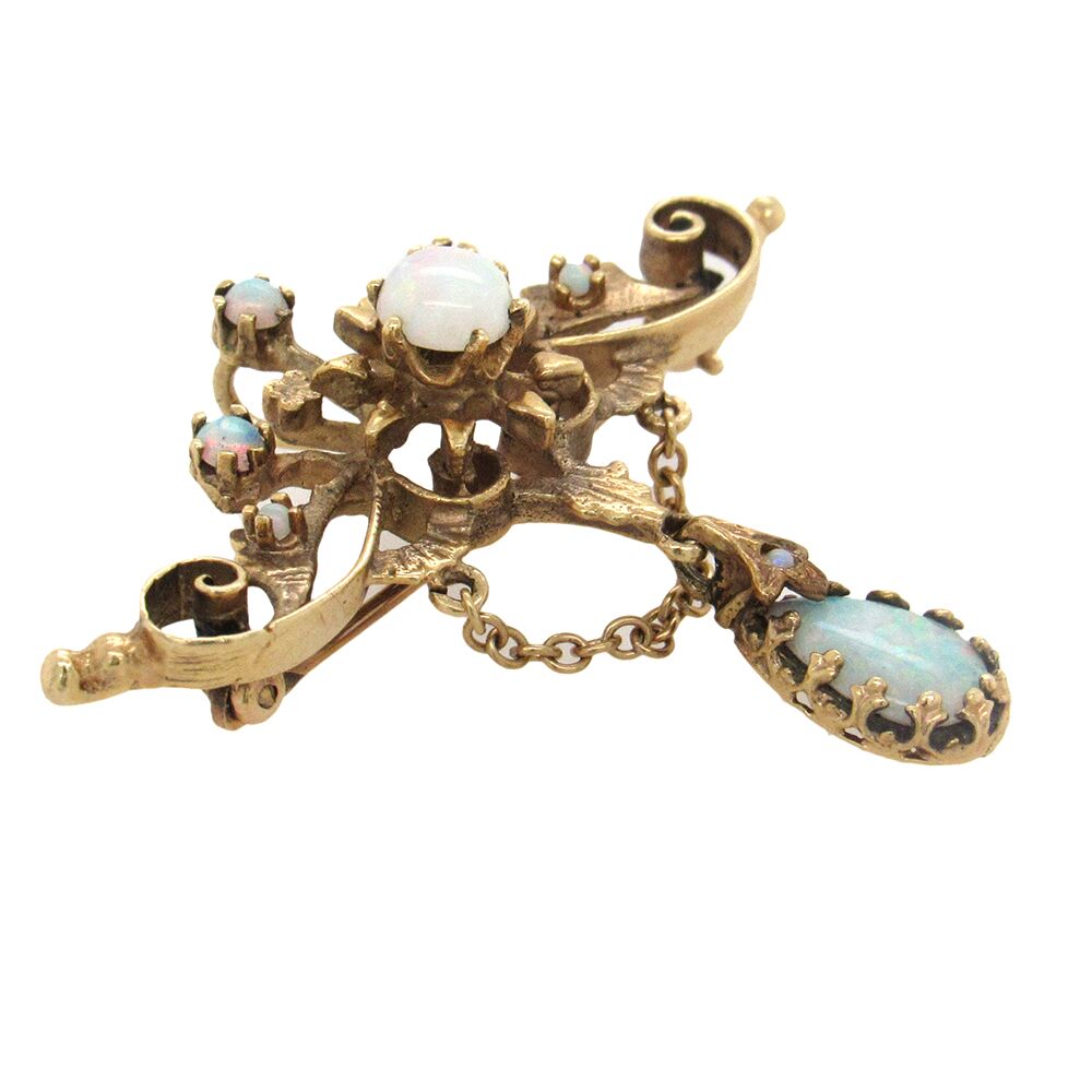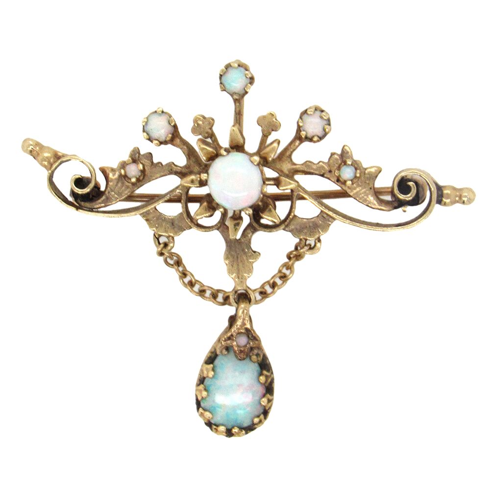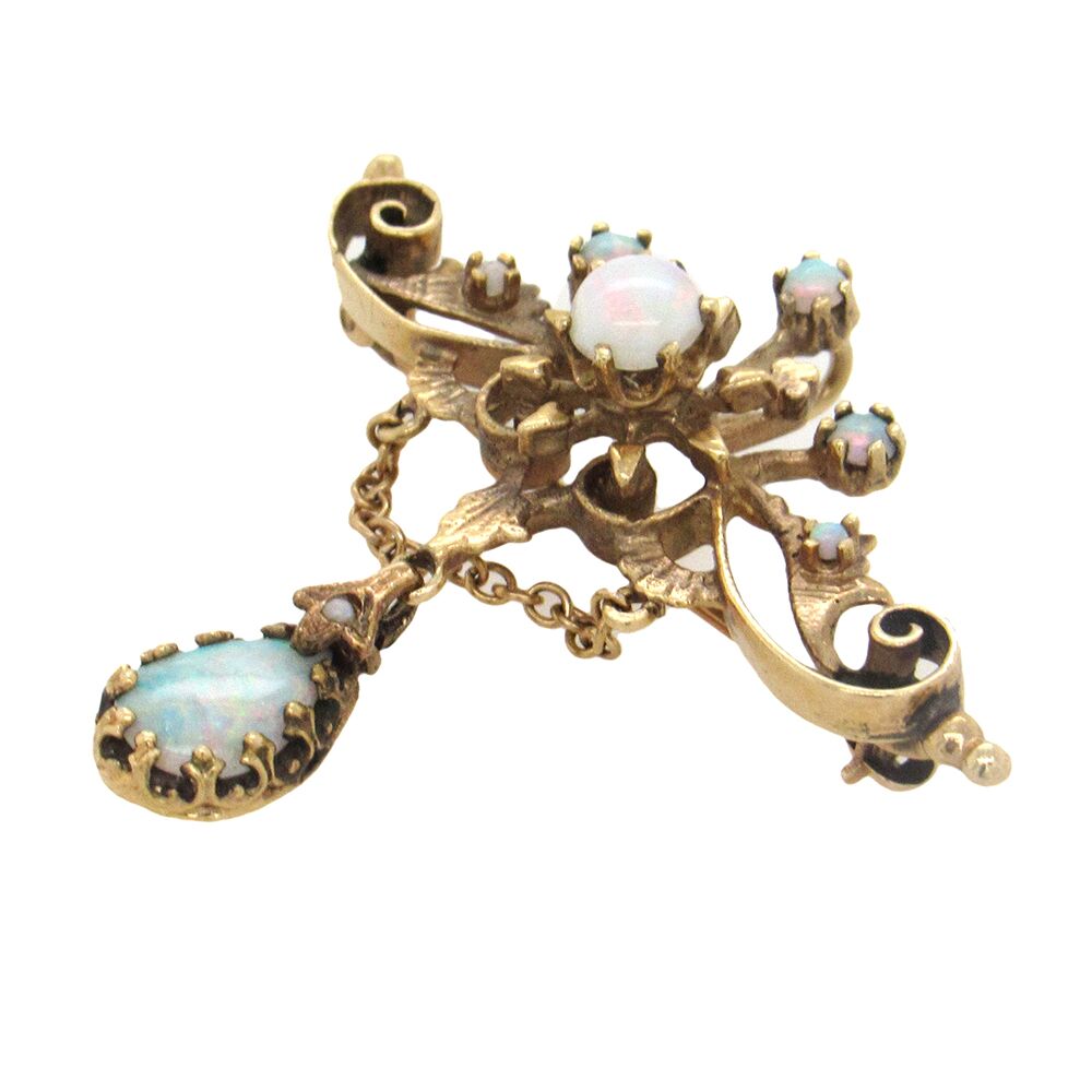 Antique 14K gold and opal drop in, set a top with round opal cabochons and a pear-shape opal in the drop. The brooch measures 1-1/2″ x 1-1/4″.