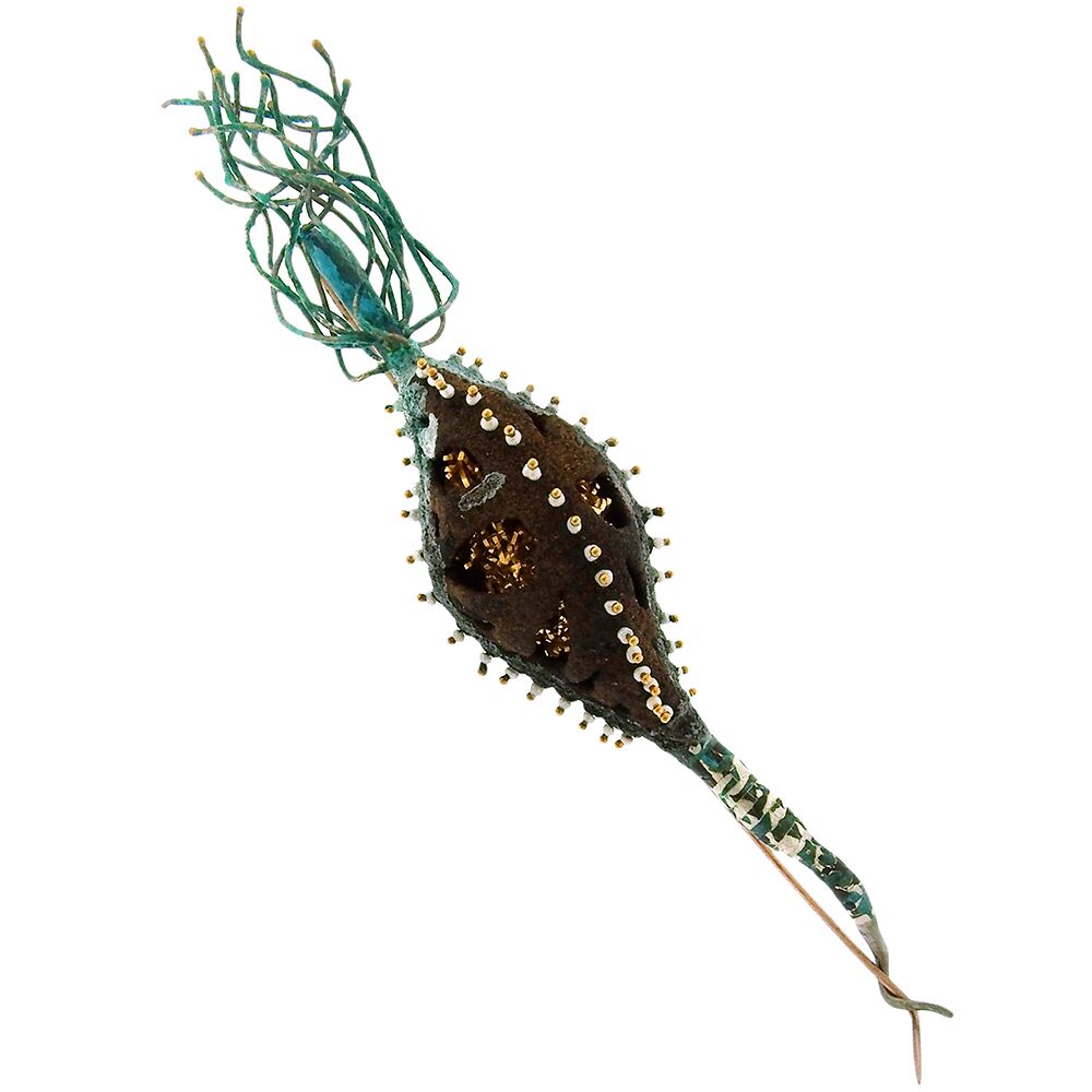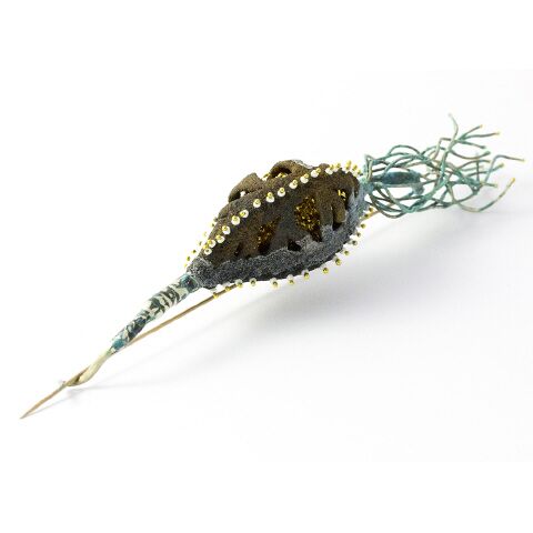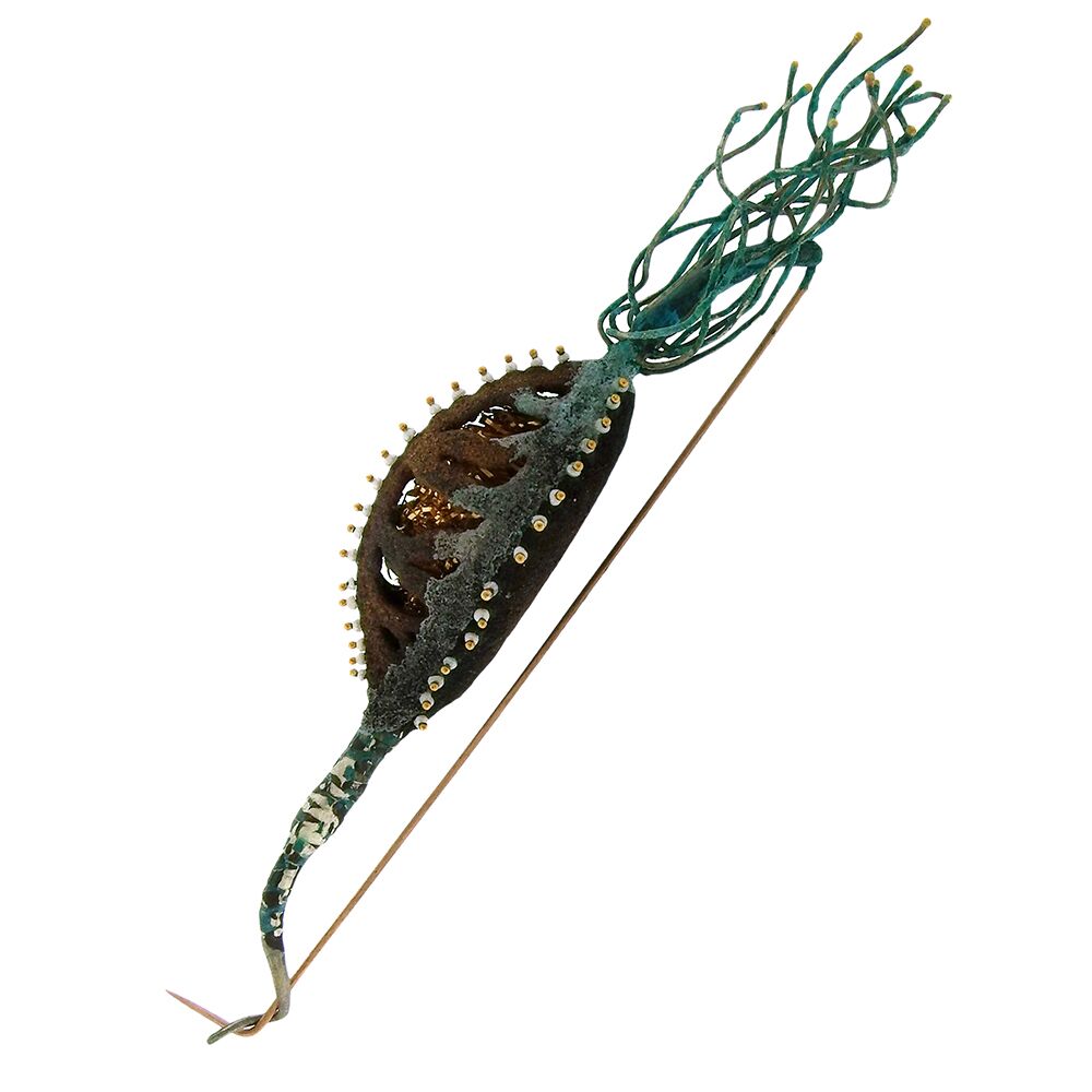 Arata Fuchi’s ‘Surge of Emotion” brooch 6-1/2″ long x 1-1/2″ x 1-1/4″, is a splendid form inspired by nature and fabricated in silver, copper, shibuichi [copper and silver alloy], 24K gold shreds, and patina. Fuchi’s inspiration he writes is “from the Japanese sense of beauty, that is ‘beauty of form that nature not artifice creates’ and the ‘vitality of nature'”.