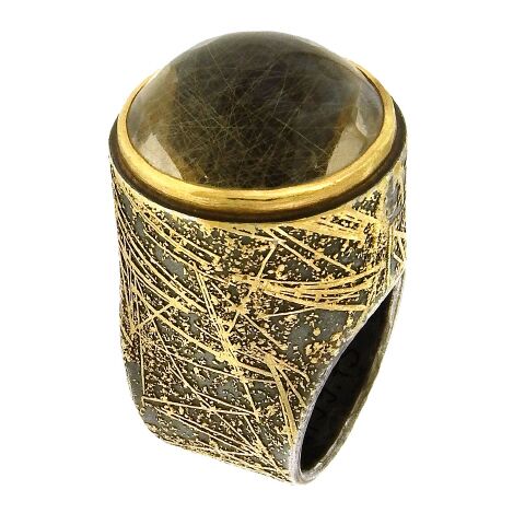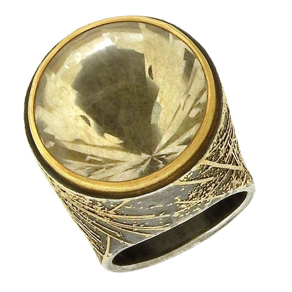 Show stopping cocktail ring by Peter Schmid/Atelier Zobel, is a fused 24K gold on sterling silver set with an unusual round cabochon rutilated quartz, the surface dimpled in precise small round concave circles, reflecting bright white light in a radiant pattern. The ring measures 7/8″ in diameter x 3/4″ above the hand.