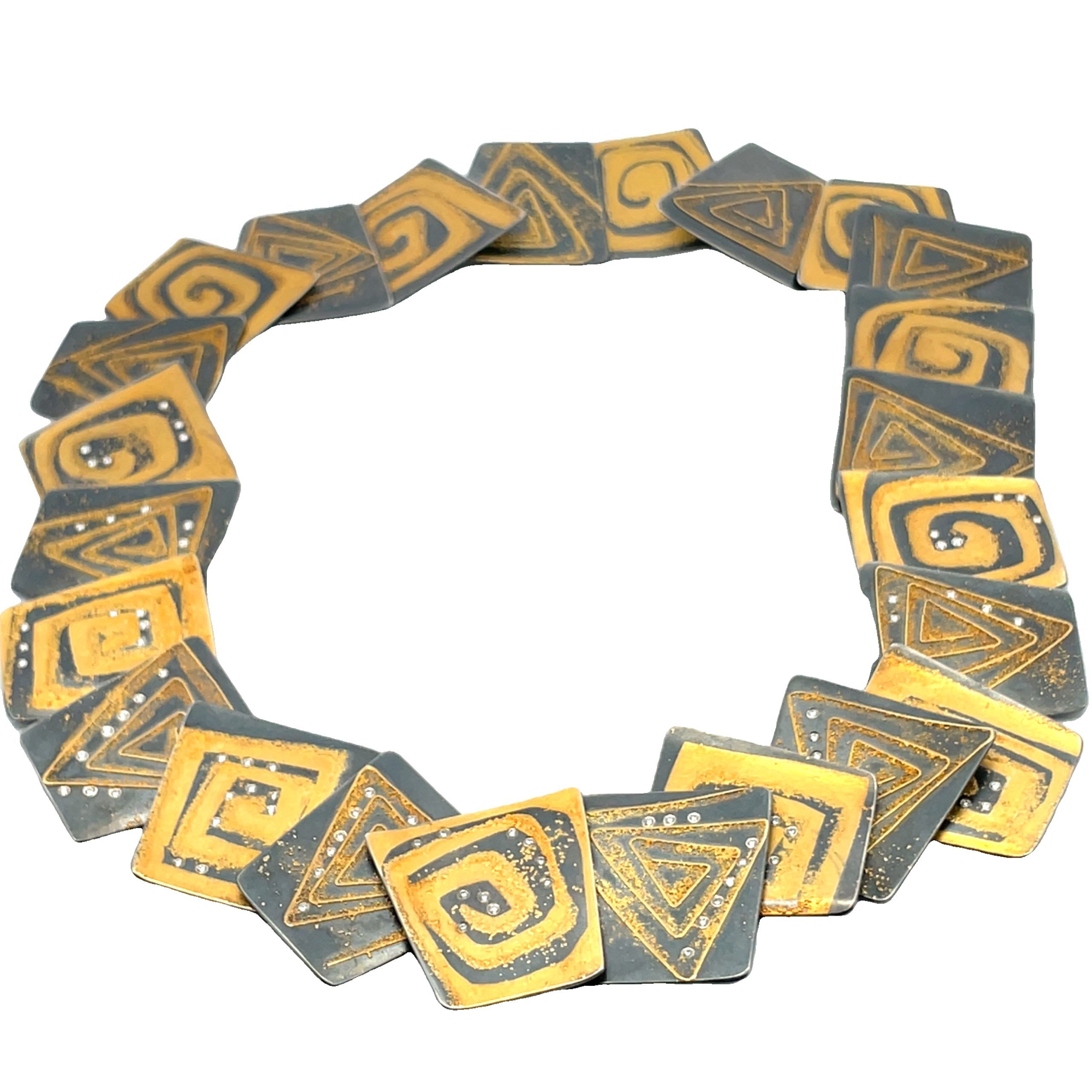 Iconic Atelier Zobel geometric ‘Trapezium’ necklace, the asymmetrical sterling and 24k gold links patterned in triangles and spirals,set with diamonds. The necklace is 21″ long, the links measure approx. 1″ x 1.25″, tw diamonds is 0.99 cts.