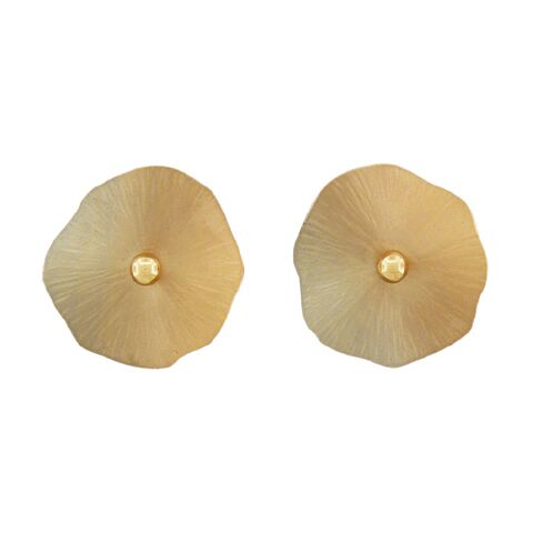 Niessing’s newest ‘Aurea’ collection shades from 18K rose gold to 18K grey gold, in an evocative warm ashes-of-roses palette that is subtle and romantic. Here, the Aurea flower earrings, designed as jackets, 5/8″ in diameter with their ruffled silken texture and polished edges glow on the ear, held by an 18K rose gold stud with special Niessing backs or by your own diamond studs.
