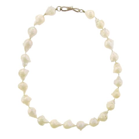Wonderfully nuggety lustrous baroque pearls are fashioned into a 16″ necklace with twisted sterling silver clasp.