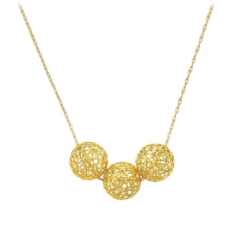 Baiyang Qiu’s 18K open cage bead necklace sets three of her laser-strong open beads, 9.5mm each, on an adjustable 18K gold chain, 16″ or 18″.