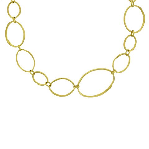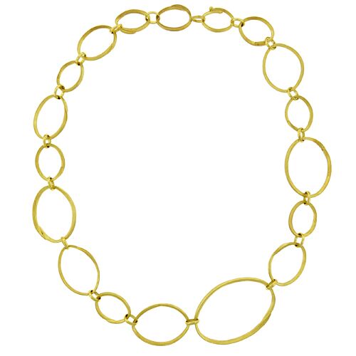 Barbara Heinrich’s hand forged Olive Leaf necklace, each concave oval link wrapped and tapering to meet in a circle,graduating largest link to smaller at the back,18″ long, to wear with the largest oval, 1-1/2″ x 1″, at front or side. .