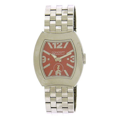 Stainless steel Bedat & Co Concept Ref. CB03 women’s quartz sports watch with bracelet has a 32mm x 29mm tonneau-shape case, case back with four screws, mirror-polished bezel, metallic salmon dial with applied silvertone oversize Arabic quarter hours and hour indexes, subsidiary seconds register, luminous hands and sapphire crystal. Stainless steel brick link bracelet with deployant clasp. The quartz movement is warrantied by Aaron Faber for 12 months. Preowned, accompanied by original box and booklet.