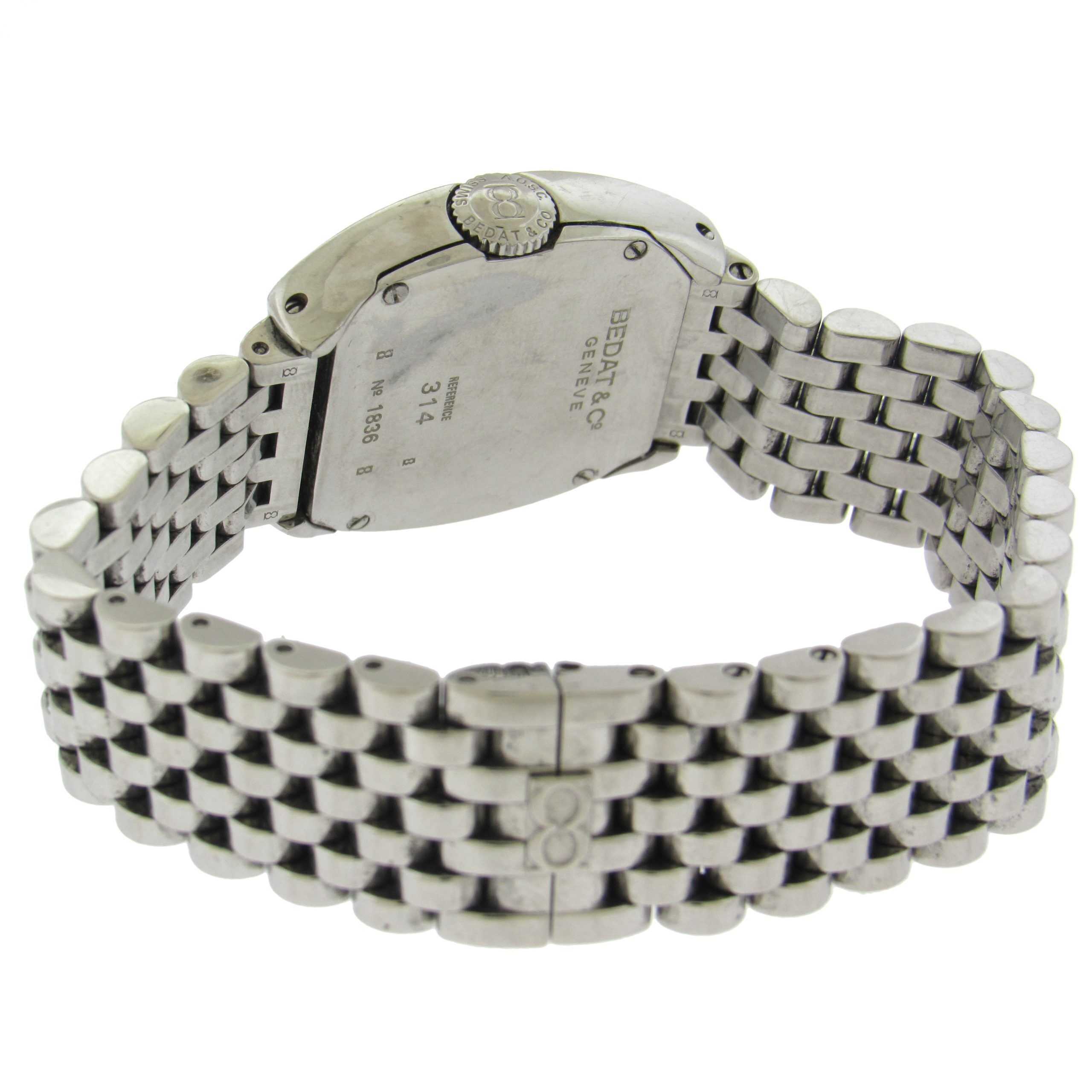 Stainless steel Bedat & Co., Genève, “No. 3”, 306,made in the 2000s, is a tonneau-shaped automatic sport wristwatch with date and a stainless steel Bedat & Co. link bracelet with a concealed deployant clasp. The case, 24mm x 32mm, has hooded lugs, flat bezel, recessed crown, case back with 4 screws, and sapphire crystal. The guilloché silver dial features painted black radial Roman numerals, outer minute track, blued steel arrow and baton hands. Automatic movement warrantied by Aaron Faber for 12 months, this is an excellent value for elegant everyday wear.