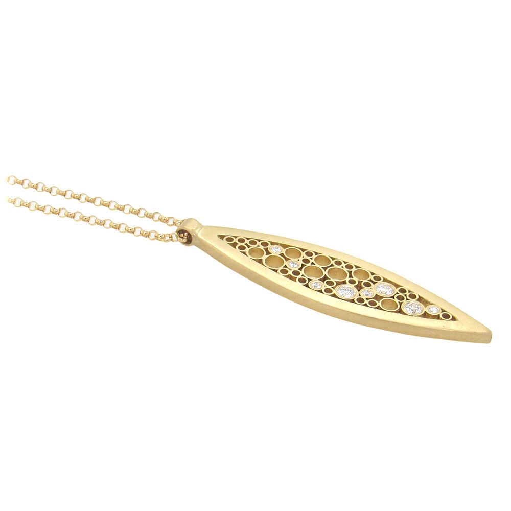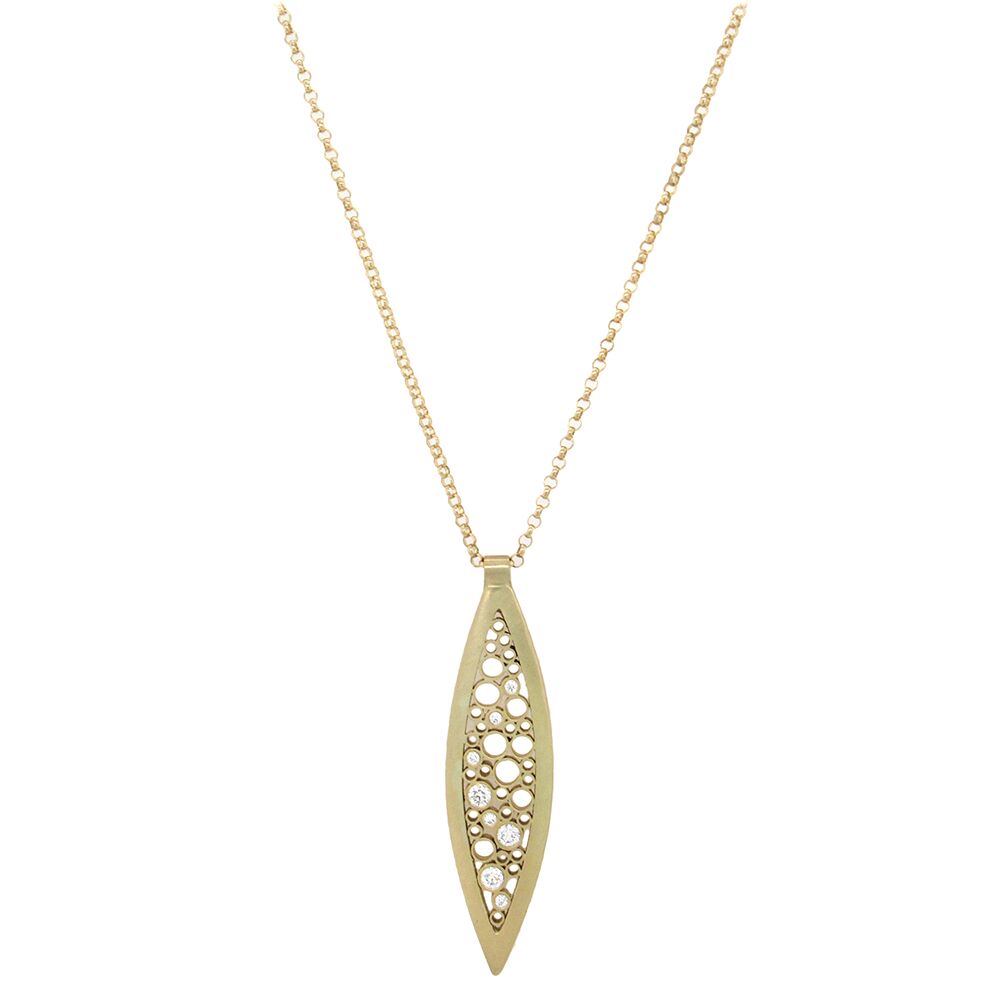 Belle Brooke’s intricate 18K yellow gold Sol long leaf pendant is an openwork marquise drop set with 0.14 cts tw diamonds, G/VS quality, on a 16″ 18K gold chain. The pendant measures 3/8″ x 1-3/4″.