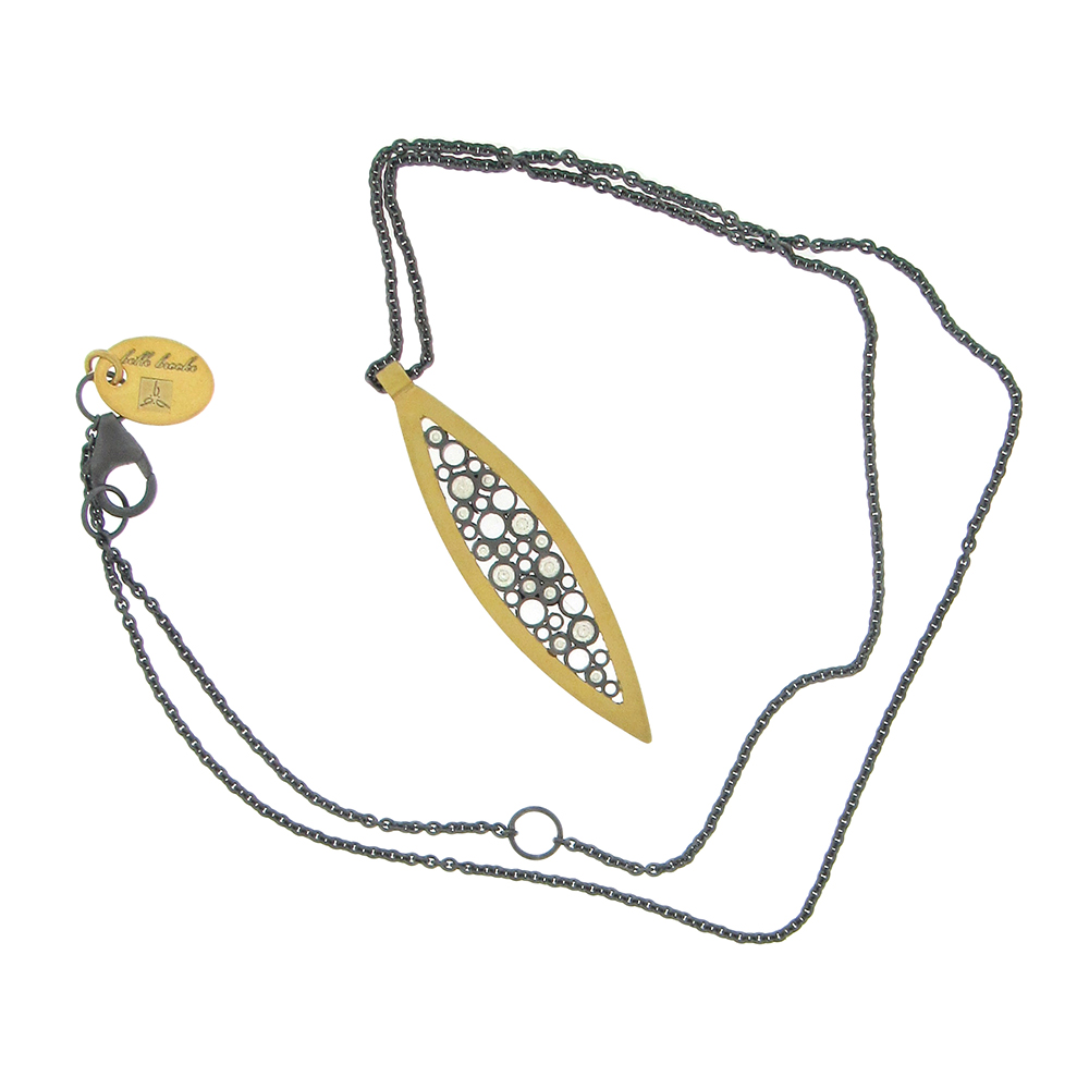 Belle Brooke’s 18K yellow gold and oxidized sterling silver marquise shape ‘Solar Flare’ pendant is set with 0.24 cts G/VS diamonds, on an adjustable oxidized sterling chain, 16″-18″ long, the pendant measures 3/8″ x 3/4″.
