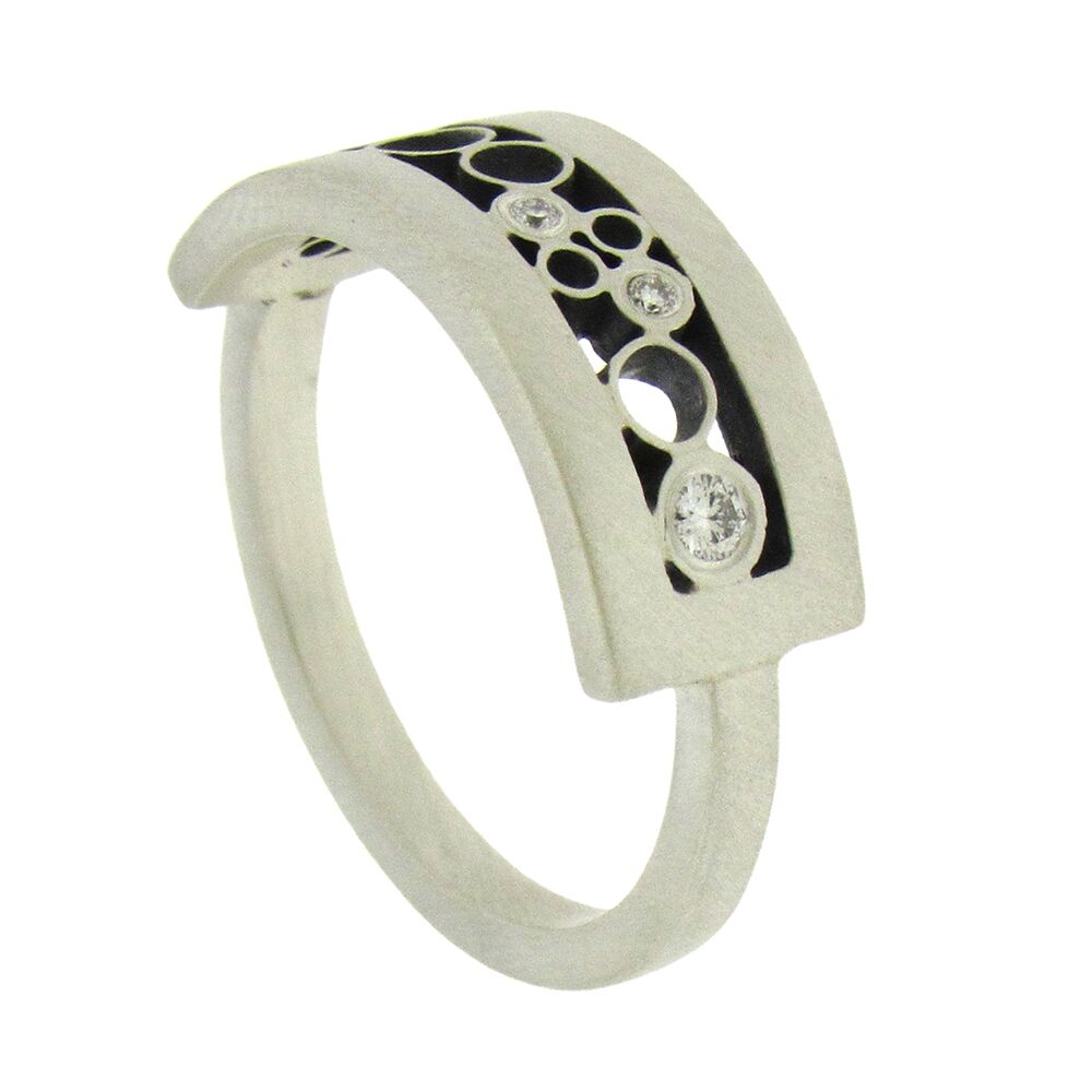 Belle Brooke’s sterling silver curved rectangular band is set with 0.06 cts diamonds. The ring measures 3/4″ x 1/4″ , 2mm shank.