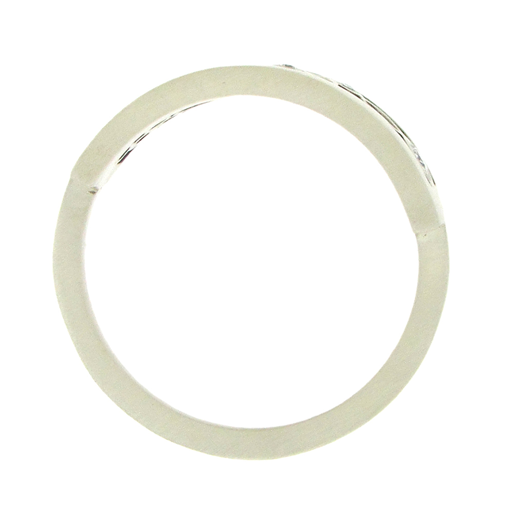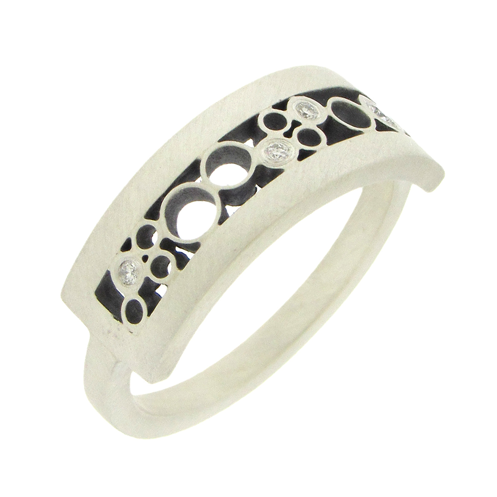 Belle Brooke’s sterling silver curved rectangular band is set with 0.06 cts diamonds. The ring measures 3/4″ x 1/4″ , 2mm shank.