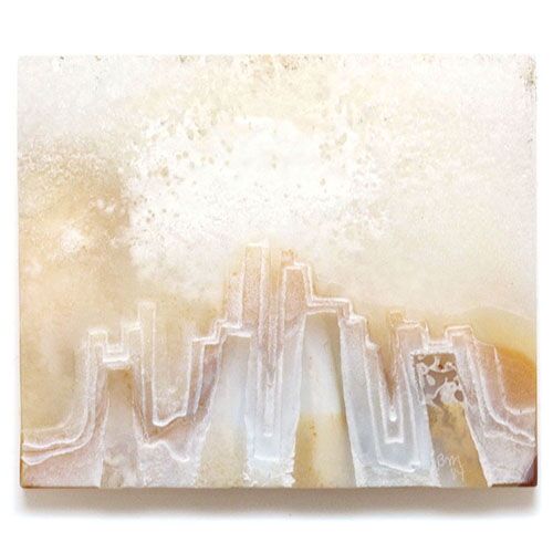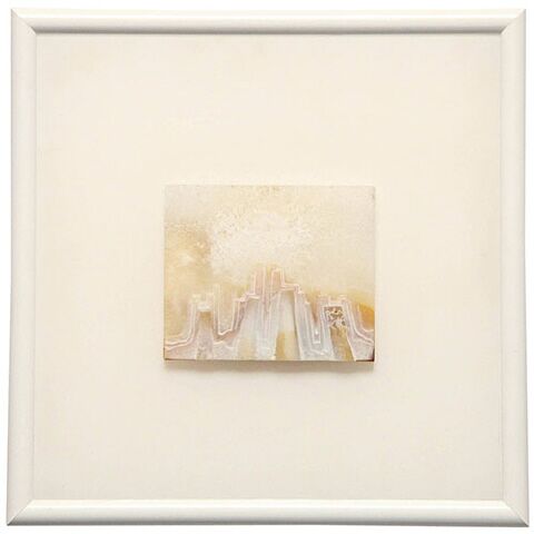 His sculptures include wall carvings, as seen here in a rare 1985 carved agate, 3-1/2″ x 3″, mounted in acrylic and framed in white wood. The layered agate ranges in shades form bright white to amber brown, a kind of monumental landscape set against a burning white round form in the background.