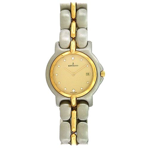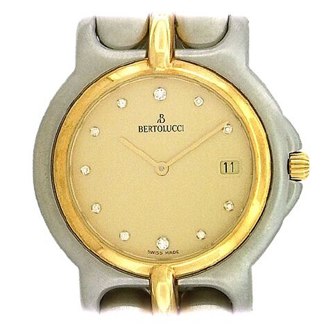 We like this Bertolucci brand watch for its excellent condition, design details, and value. The two tone stainless steel and 18K gold quartz powered wristwatch, originally designed for men, is a perfect scale for a larger watch for women. The 35mm case has a matte stainless steel case with curved lugs, polished 18K gold bezel, protected gold crown, champagne dial with diamond hour markers and date window at 3 o’clock, and two-tone stainless steel and 18K gold verterbrae design bracelet with deployant clasp. The quartz standardization movement is warrantied by Aaron Faber for 12 months.