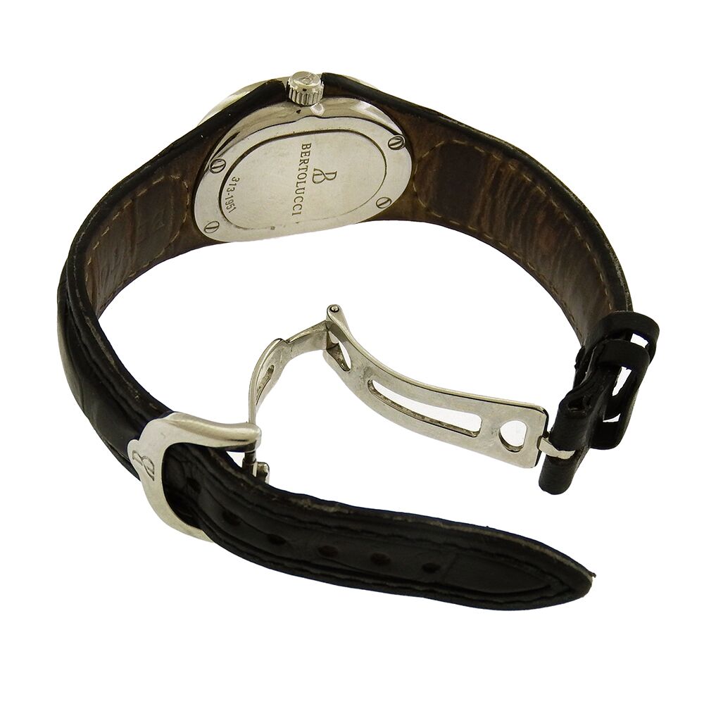 Midsize stainless steel Bertolucci Serena, with 25mm x 34mm curved case, features a quartz movement, diamond bezel, white dial, black leather strap and deployant closure. The carefree quartz movement is warrantied by Aaron Faber for 1 year.