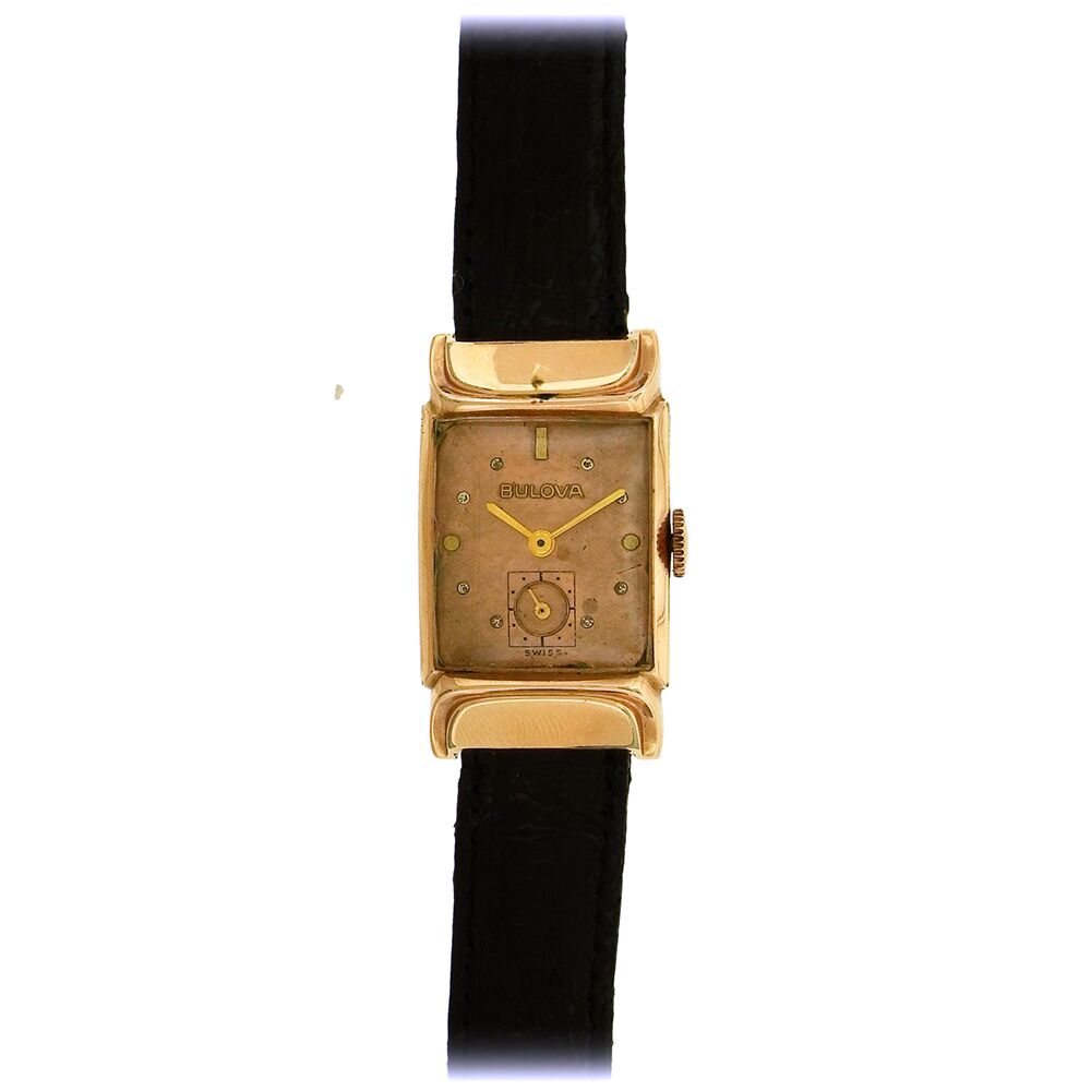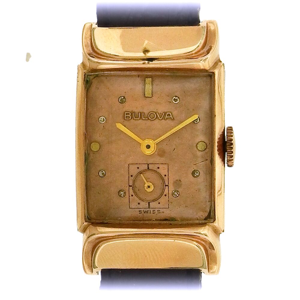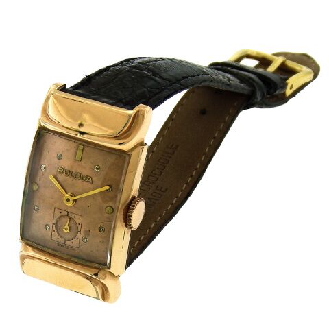 Bulova was a major competitor in the American wristwatch style wars of the 20th century, easy to see in this 1940’s rose gold-filled tank with sculpted hooded horn-shape lugs. The gold-fill case measures 21mm x 24mm with extend hooded lugs, rose tone dial with applied yellow goldtone dot and baton hour indexes and subsidiary seconds register, yellow baton hands. 17J manual wind movement warrantied by Aaron Faber for 12 months, a great value alone.