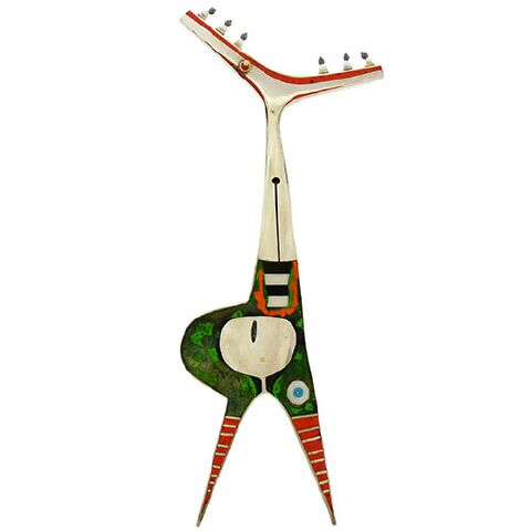 Tod Pardon’s whimsical sculptures are inspired by dreams, modernism, imagination, and his travels in Africa. Here, the sterling silver figurine with open mouth, titled Butte. is inlaid with colorful orange and green pigments, simulated ivory , wood and turquoise. The brooch measures 2-3/4″ at the widest x 7″ high. The accompanying stand measures 2-1/2″ square x 2-3/4″ high.
