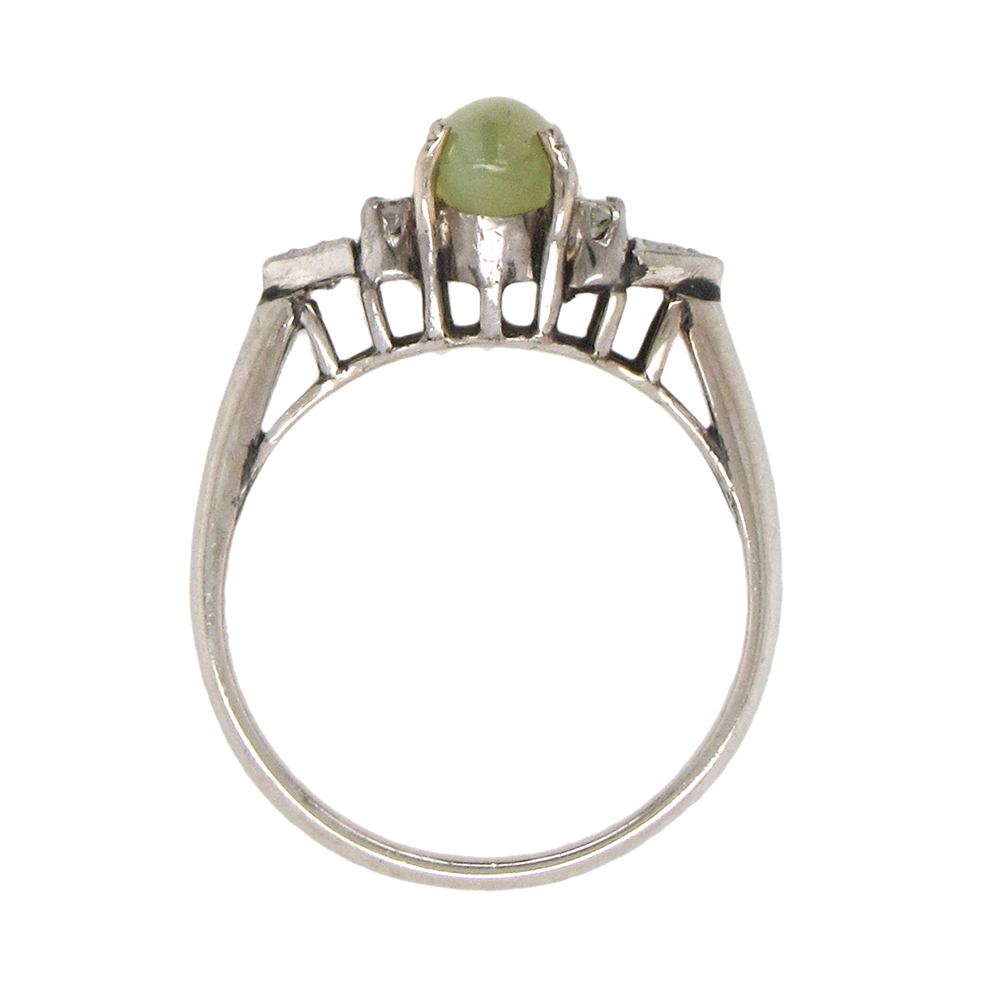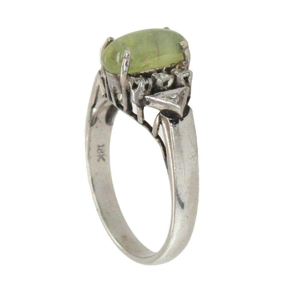 Gemstone ring set with an oval cabochon cat’s eye chrysoberyl, approx. 2.75 carats, set in a diamond-accented 18K white gold mounting.