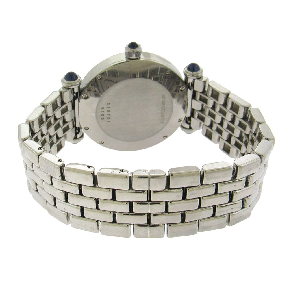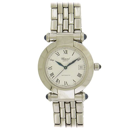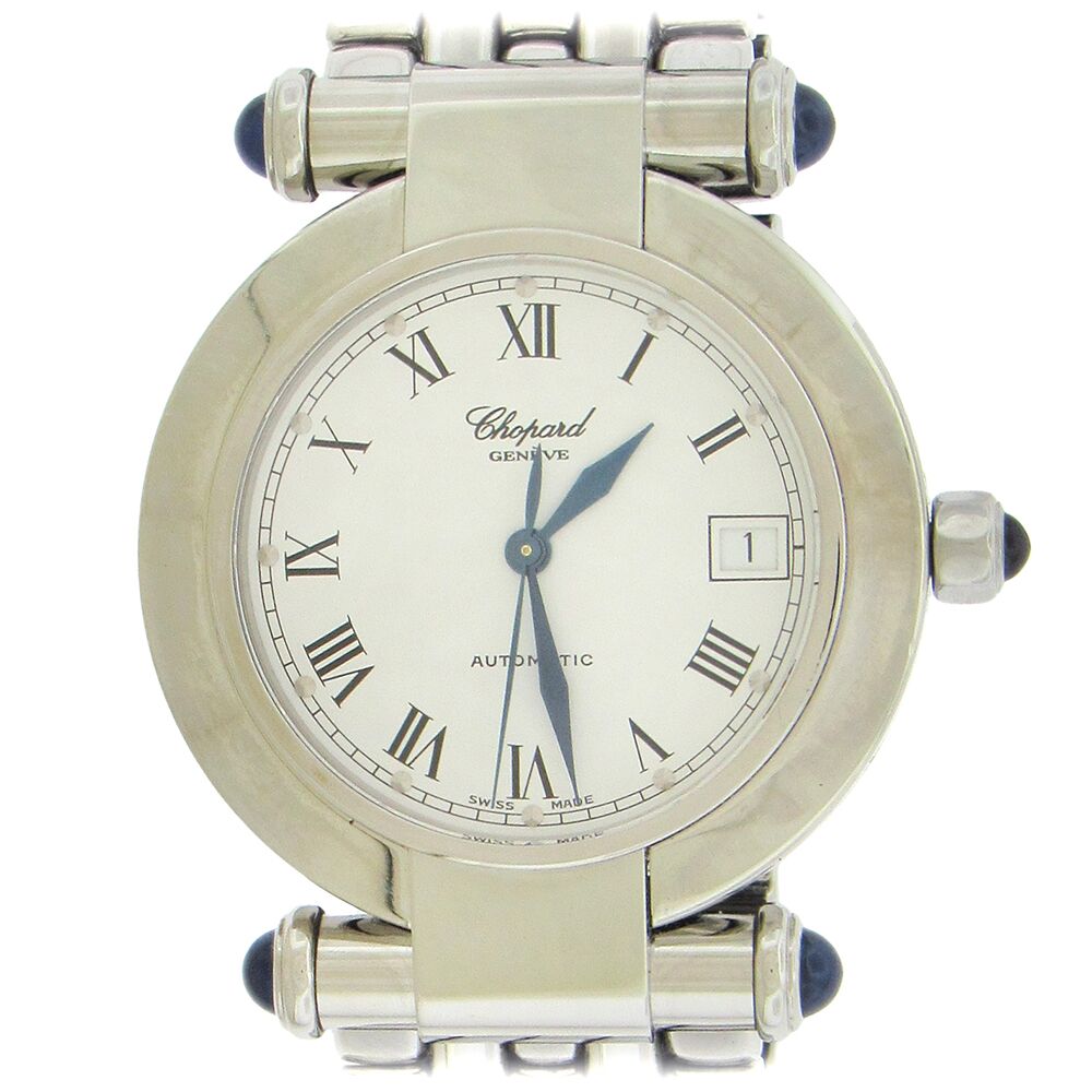 Stainless steel Chopard Imperiale, Ref. 37/8243- 23, made in the 1990’s, is a water resistant, self-winding, center-seconds stainless steel wristwatch with a date and stainless steel Chopard bracelet with hidden clasp, accompanied by original box and papers, and alternate purple crocodile strap. The 36mm case has a stepped bezel, case back with 8 screws, T-bar style lugs with blue sapphire cabochons, winding crown with sapphire and sapphire crystal. The white dial features painted black roman numerals, aperture for the date, and blued steel alpha hands. The movement is caliber 889/2, 36 jewels, automatic, warrantied by Aaron Faber for 12 months.