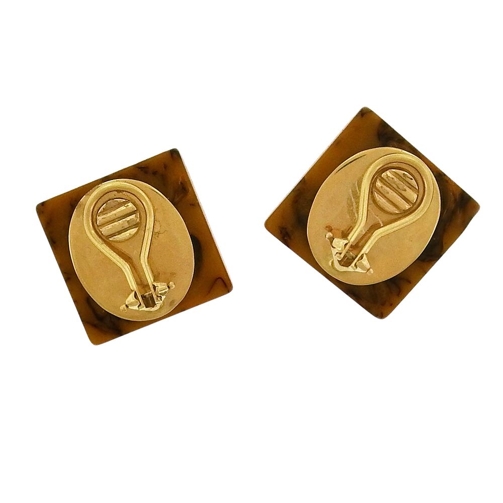 Circa 1970’s earrings set diamonds, approx. 2.25 carats, in faux tiger-eye resin squares, light and easy to wear, for these very Mod clip-on earrings, measuring 3/4″ x 7/8″. 14K gold omega backs.