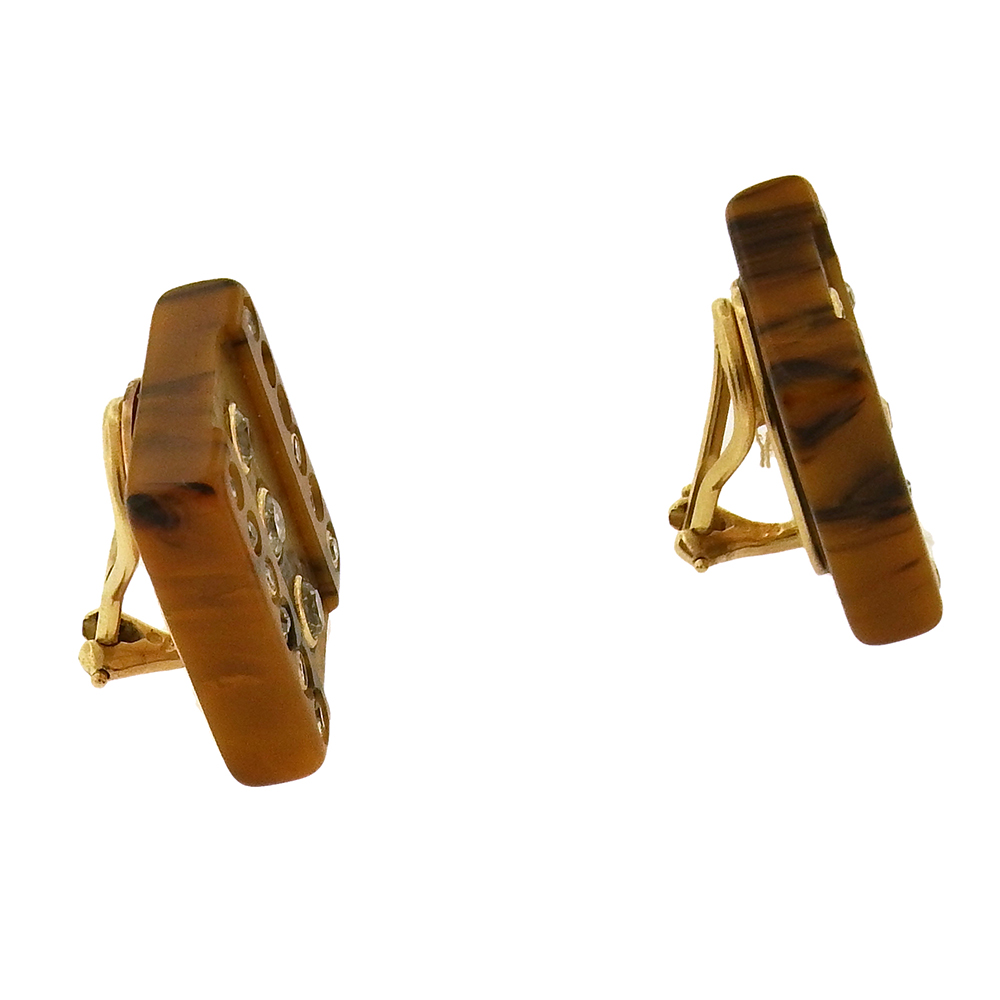 Circa 1970’s earrings set diamonds, approx. 2.25 carats, in faux tiger-eye resin squares, light and easy to wear, for these very Mod clip-on earrings, measuring 3/4″ x 7/8″. 14K gold omega backs.
