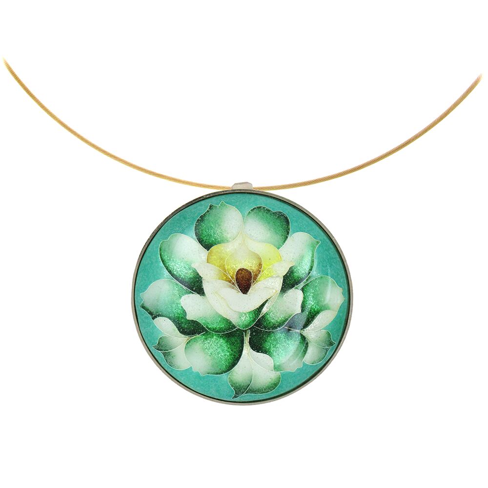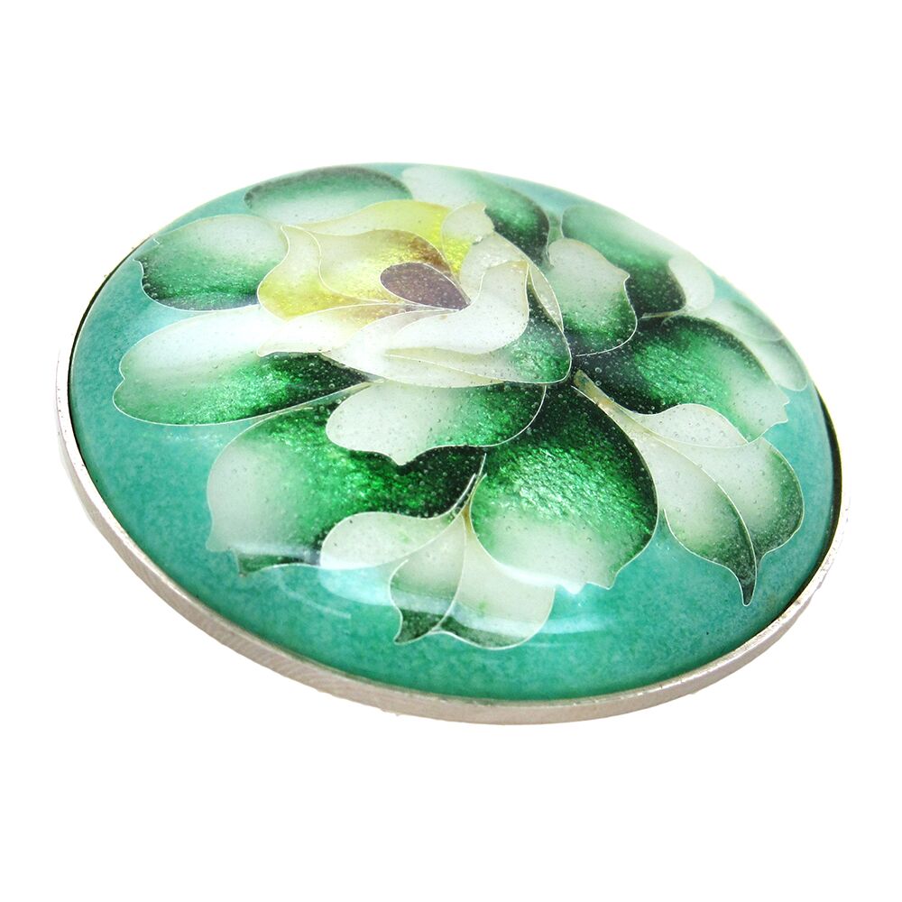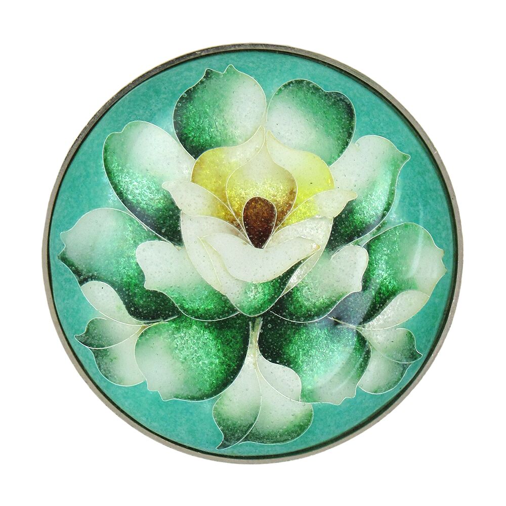 Vintage cloisonne enamel green, cream and yellow flower brooch and pendant is beautifully made with layers of depth and transparency depicting the many layers of petals. The brooch pendant is 1-1/2″ diameter, set in rhodium white metal.