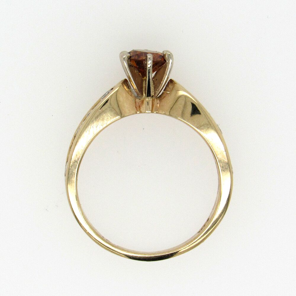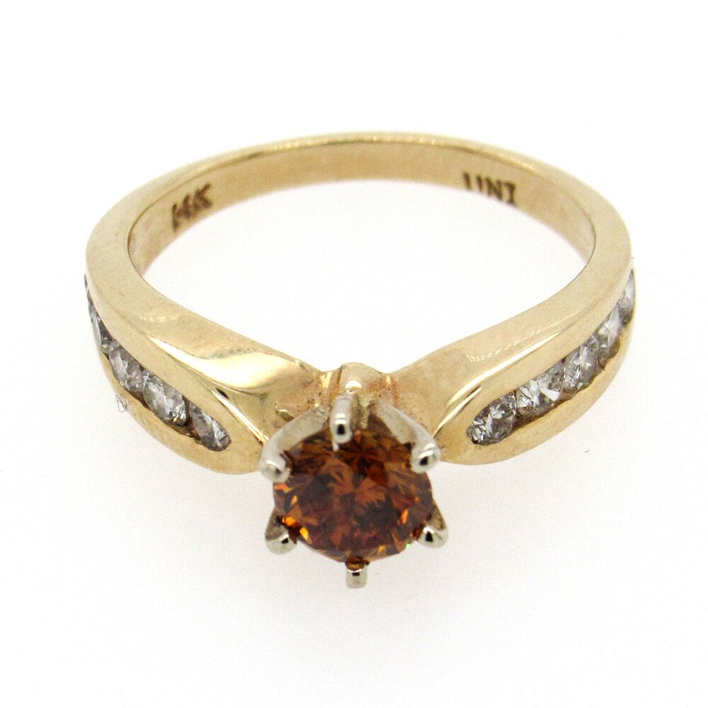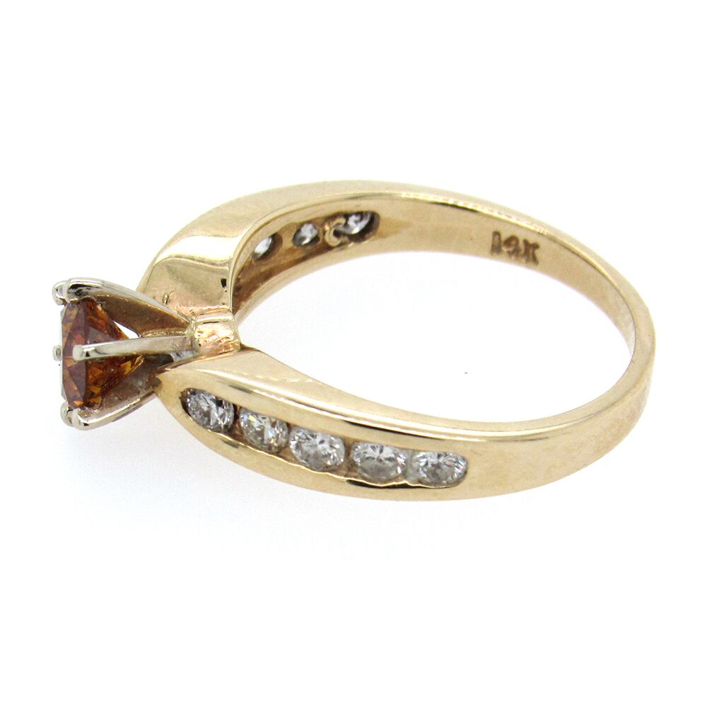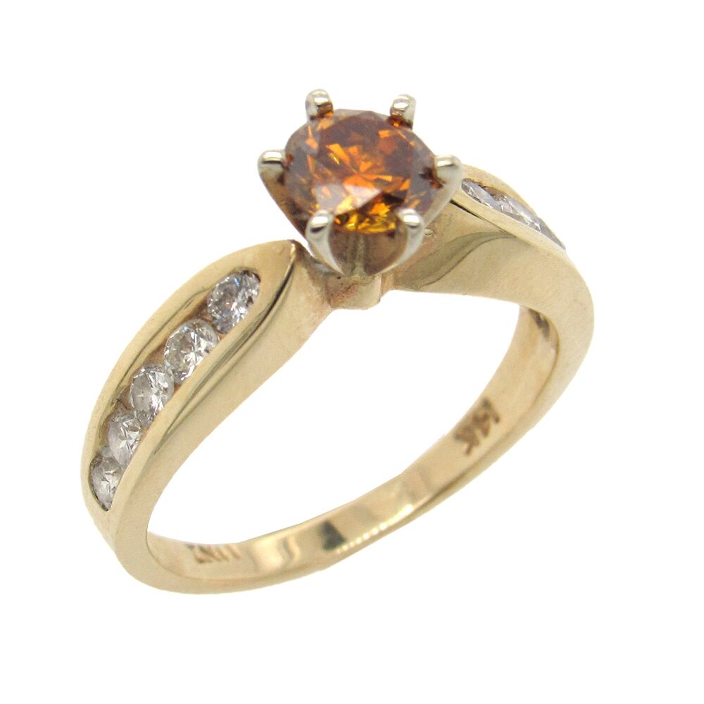 Estate diamond engagement ring set with a cognac diamond (orangy-brown, approx. 0.75 tw), with channel-set colorless diamonds, approx. 0.12 cts tw. The 14K mounting measures 5/8″ x 1/8″, size 5-1/4.