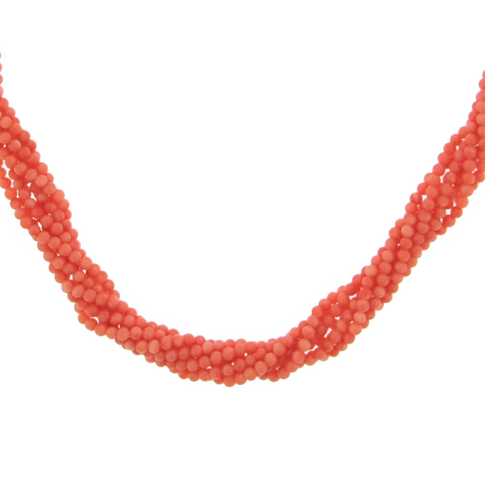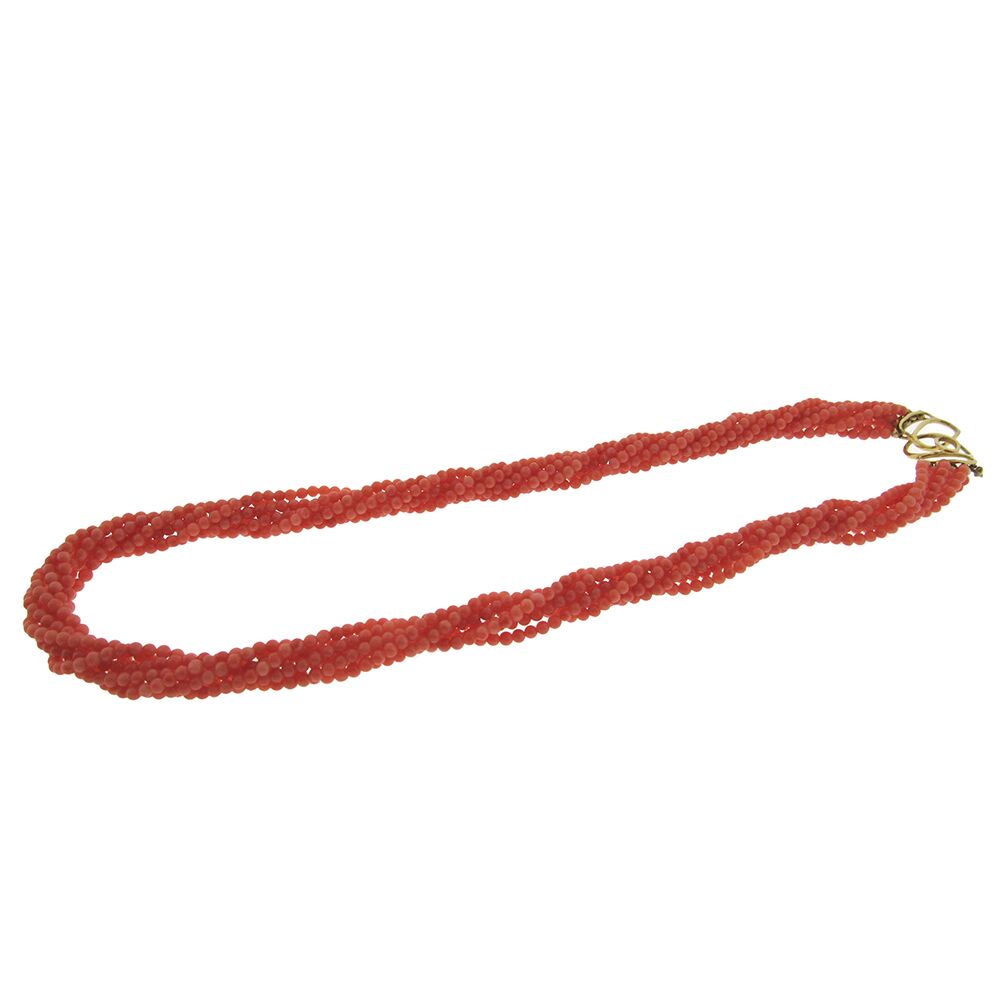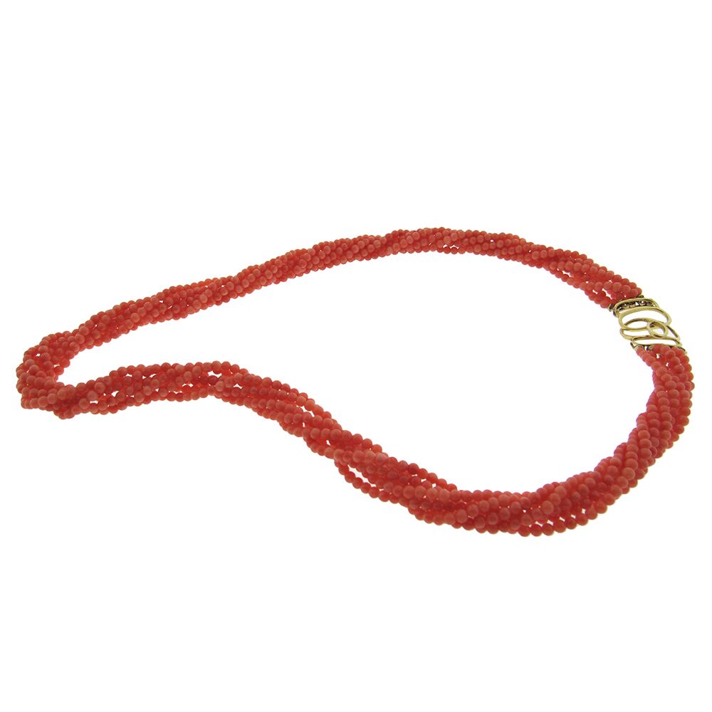 Seven-strand 2.5mm coral bead necklace, 16-1/2″ long, with 18K yellow gold butterfly clasp.