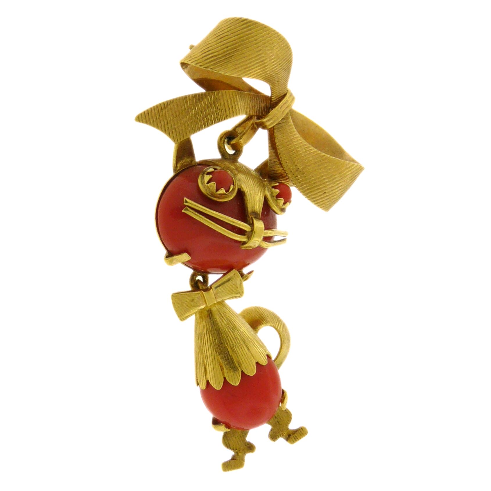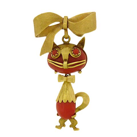 These animal jewels from the 1940’s, 50’s and 60’s were worn in groups, on sweaters, coats, hats, handbags and scarves! Here, a 1960’s “cool cat” in coral and gold dangles from the detachable bow pin, all 14K yellow gold, from Carl Art. The bow pin alone measures 1″ x 3/8″, the entire jewel measures 1″ at the widest x 2″ h.