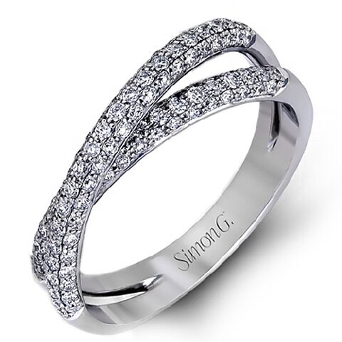 We love Simon G’s very modern criss-cross micropavé double diamond band, set with 1.01 carats of diamonds, and a great ring to wear alone or as a companion to SimonG’s engagement ring shows, sold separately.