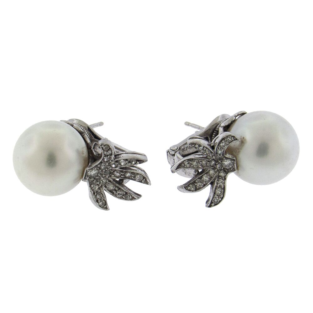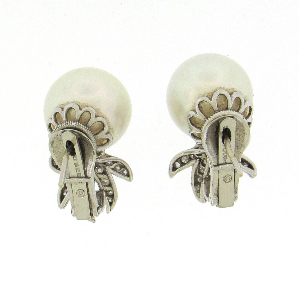 Large lustrous platinum-white 12.5mm South Sea pearls are the focal point of David Webb’s charming earring, set in platinum with a diamond spray design. 1″ long, post and omega back, ca. 1980’s. David Webb is the famed New York jewelry salon, founded in 1948, whose animal and nature-inspired jewels have been collected by Elizabeth Taylor, the Duchess of Windsor and Princess Grace, to name a few.