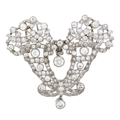 A diamond double cornucopia pin brings good fortune to the wearer, and this one carries its own fortune, with approx. 5.30 carats of old European cut, old mine cut and rose cut diamonds. Pin back is a later addition to this early 20th century Edwardian jewel. 1-3/4″ long x 1-7/8″ at the widest.