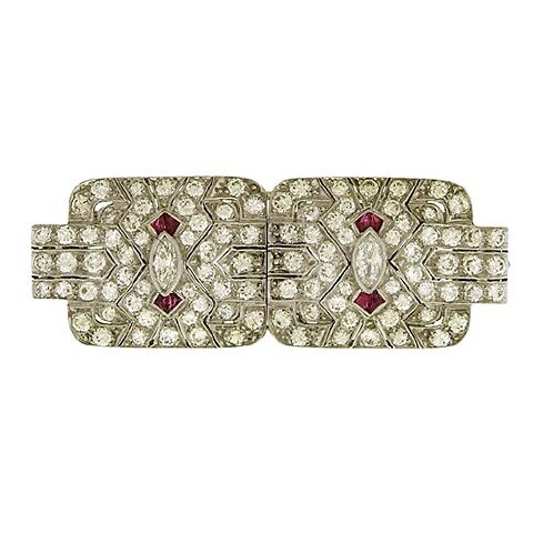 Double diamond clip, approx. 5.50 carats circa 1950’s, is set in platinum in with center marquise diamonds and accents of triangular calibré rubies. The clips can be worn as a single brooch, 2″ x 3/4″, or separately, each clip 3/4″ x 1″.