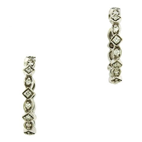 Diamond and gold hoop earrings by designer Diana Heimann, circa 2000, are 1″ in diameter, alternating milgrain ovals and squares, each set with diamonds, 18K white gold.